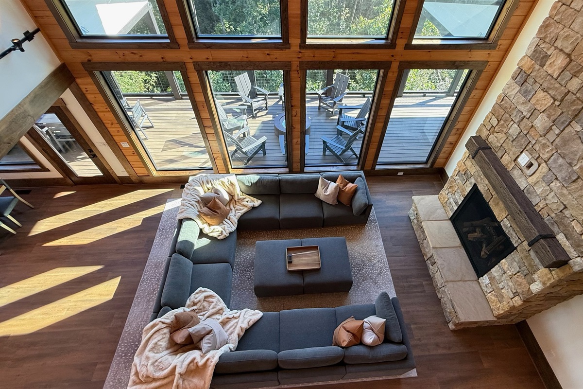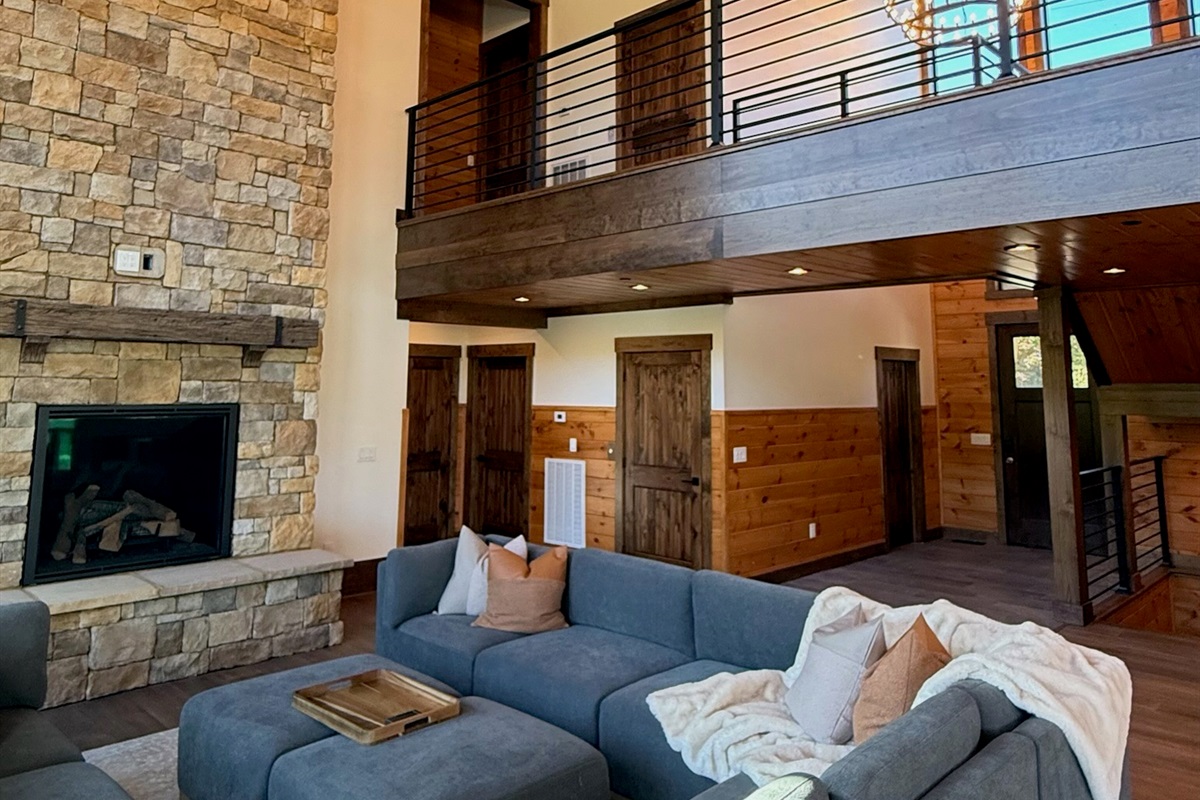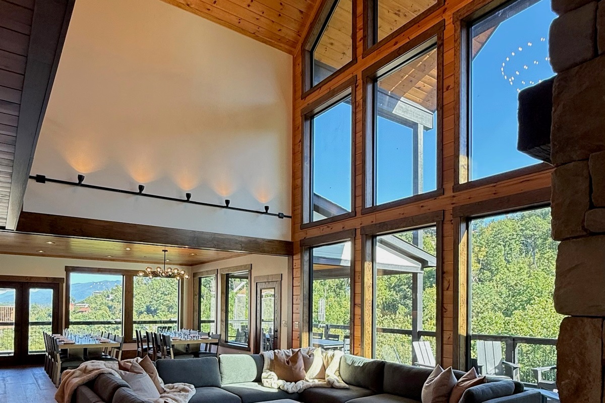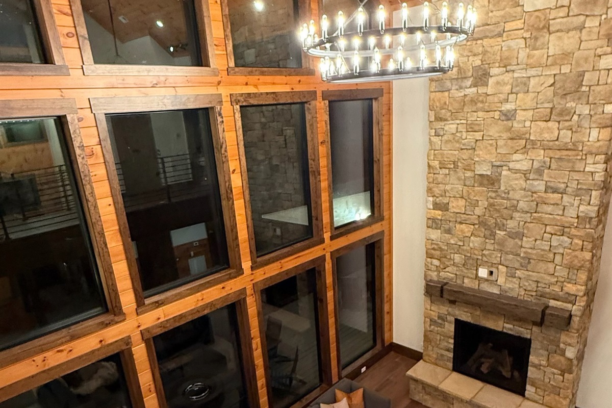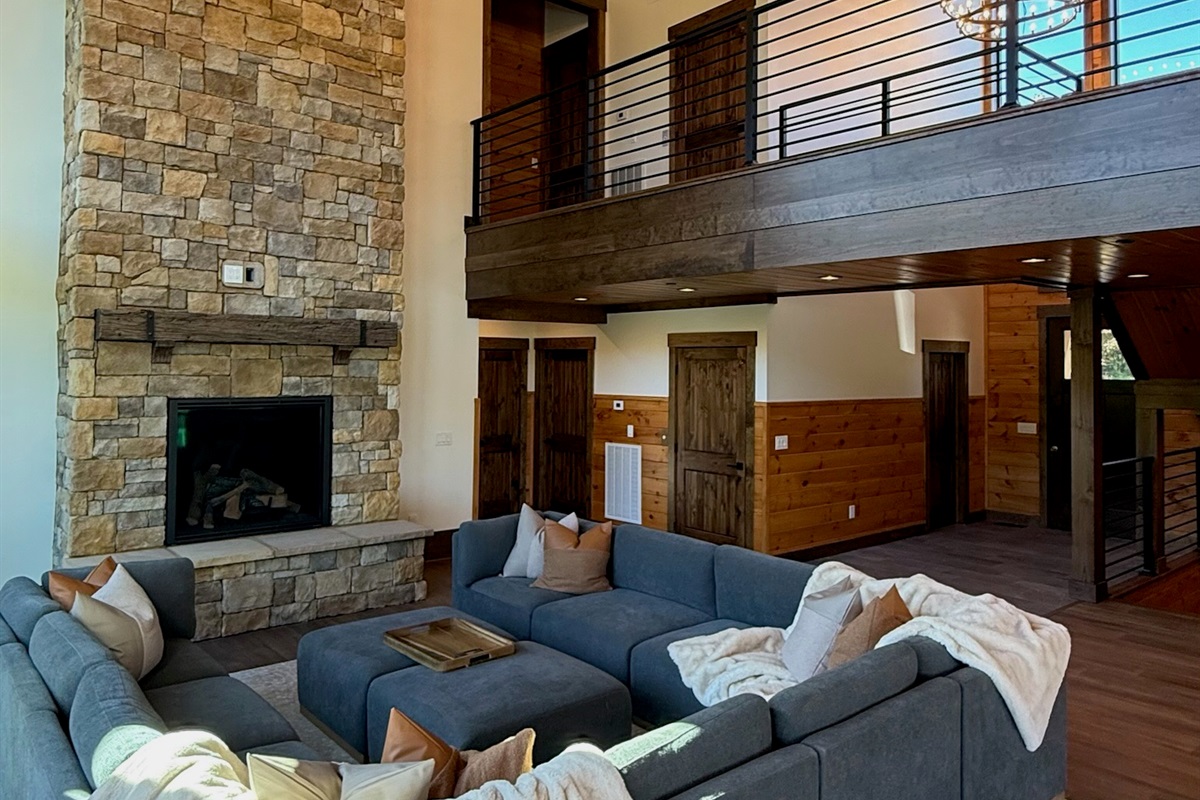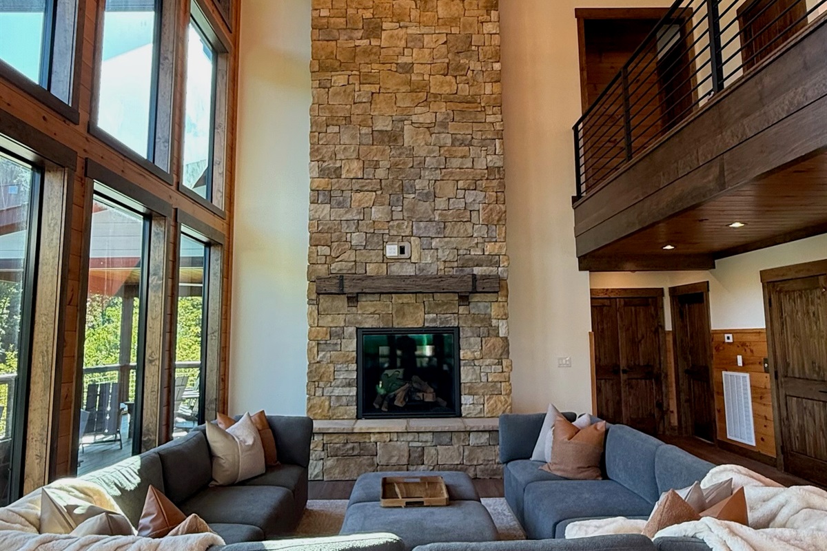 Soaring 30-foot ceilings with huge windows to bring the outdoors in; a dramatic floor-to-ceiling stone fireplace anchors the main living area, creating a warm, open space ideal for gathering with family and friends. Each of the 8 spacious bedrooms includes its own private en-suite bathroom, offering luxury and privacy for all guests. With over 8,000 square feet, there’s ample space for all.