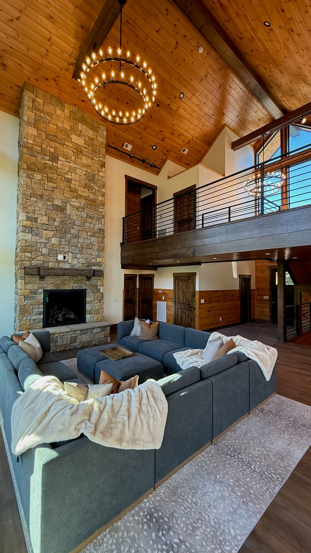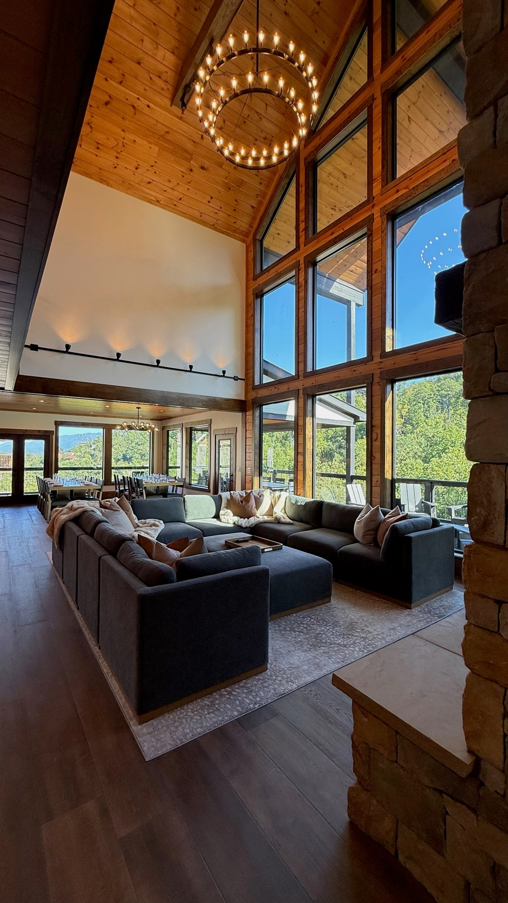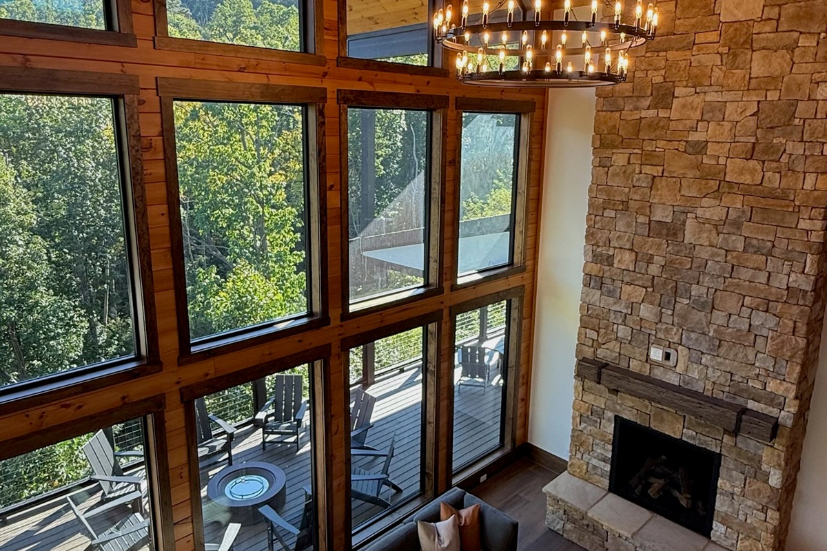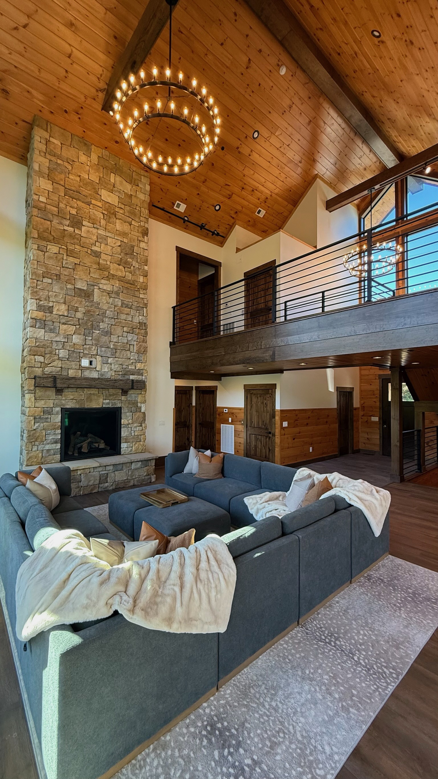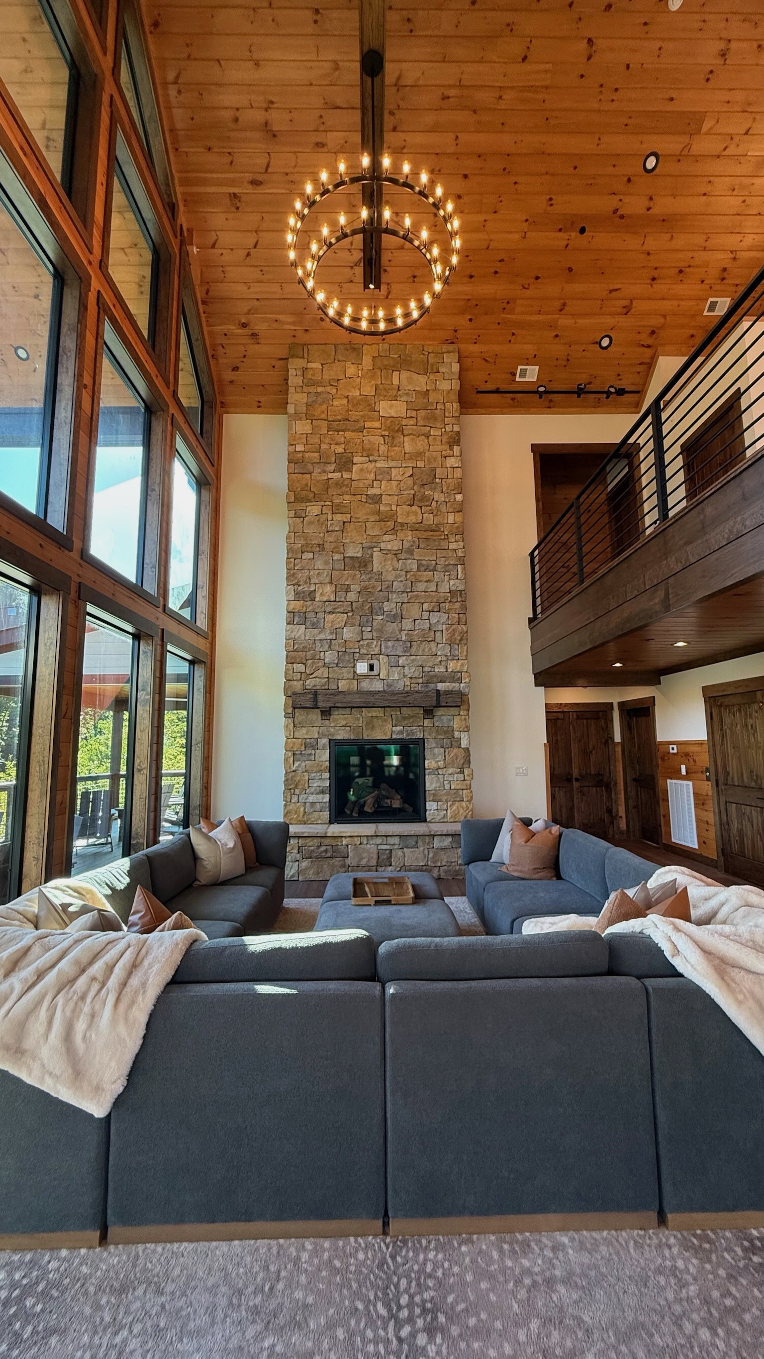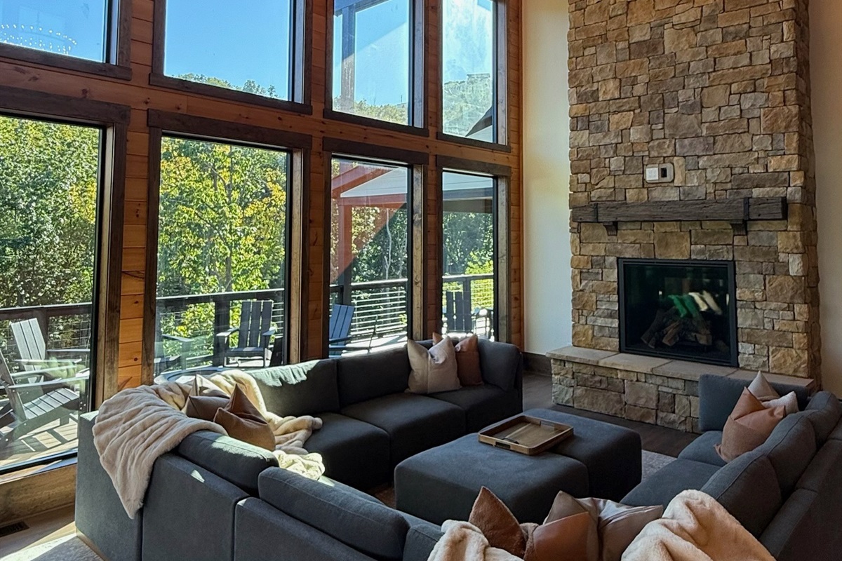 Soaring 30-foot ceilings with huge windows to bring the outdoors in; a dramatic floor-to-ceiling stone fireplace anchors the main living area, creating a warm, open space ideal for gathering with family and friends. Each of the 8 spacious bedrooms includes its own private en-suite bathroom, offering luxury and privacy for all guests. With over 8,000 square feet, there’s ample space for all.