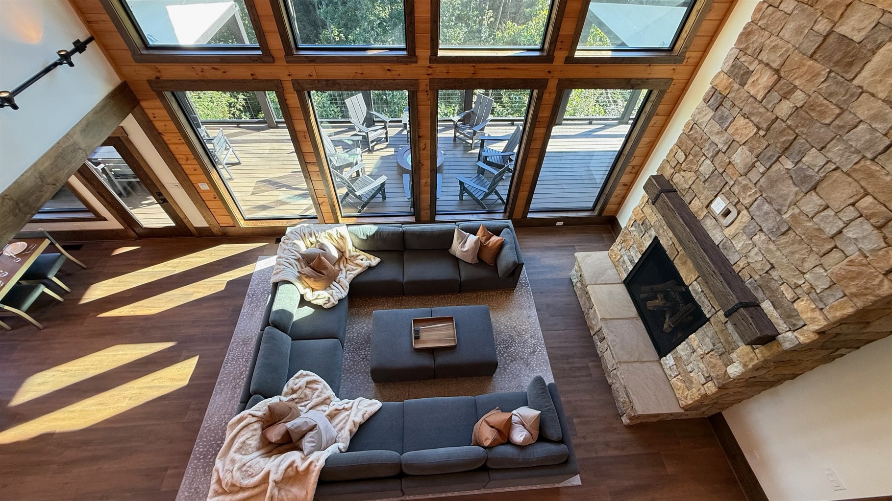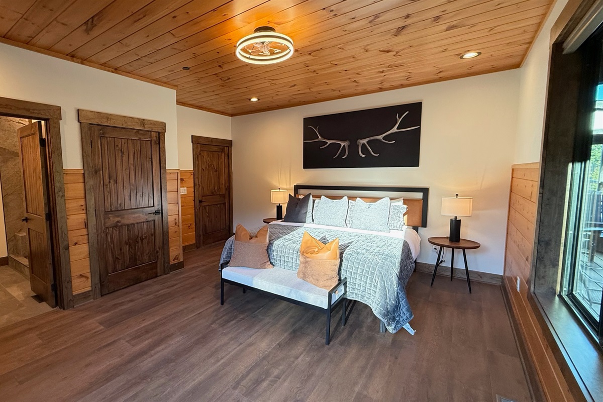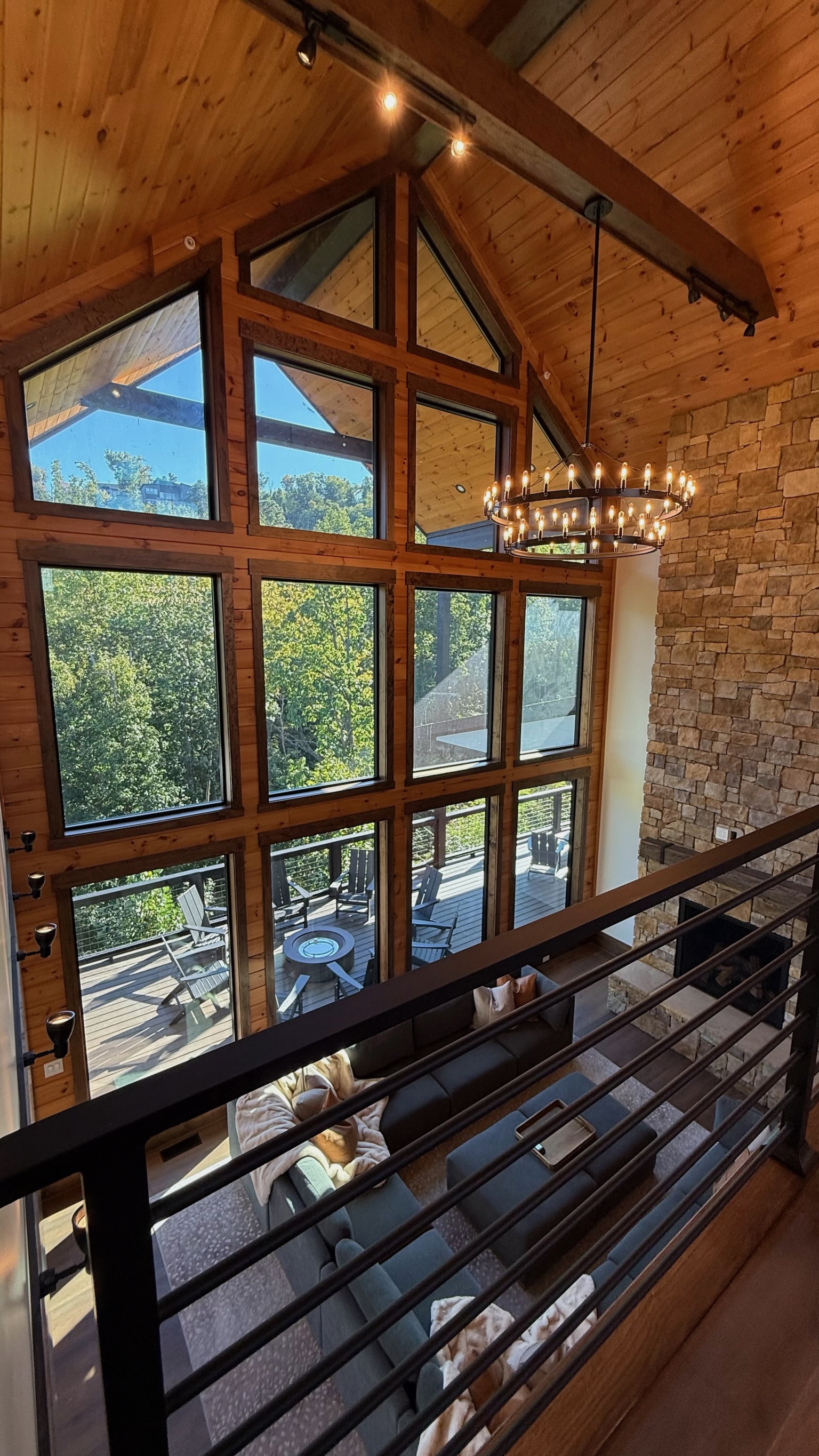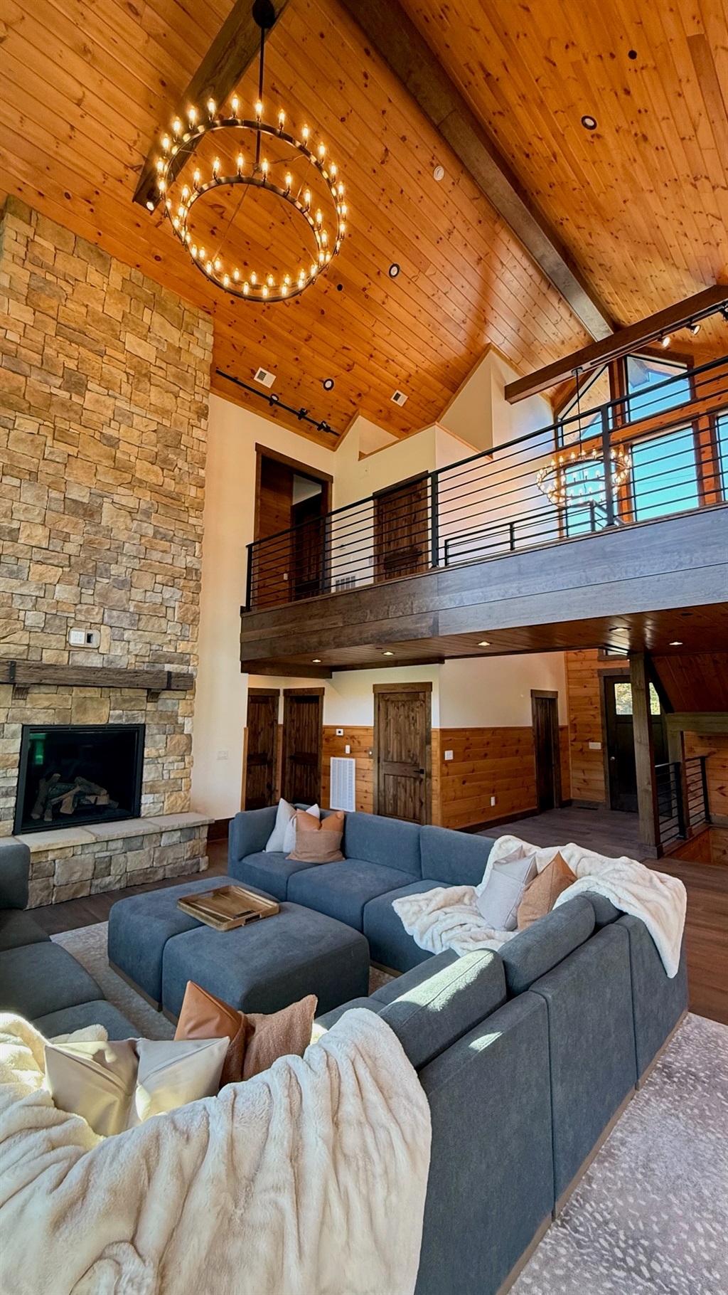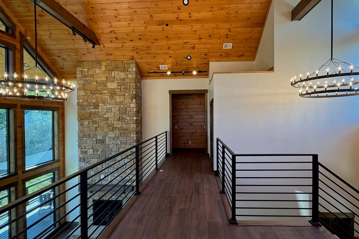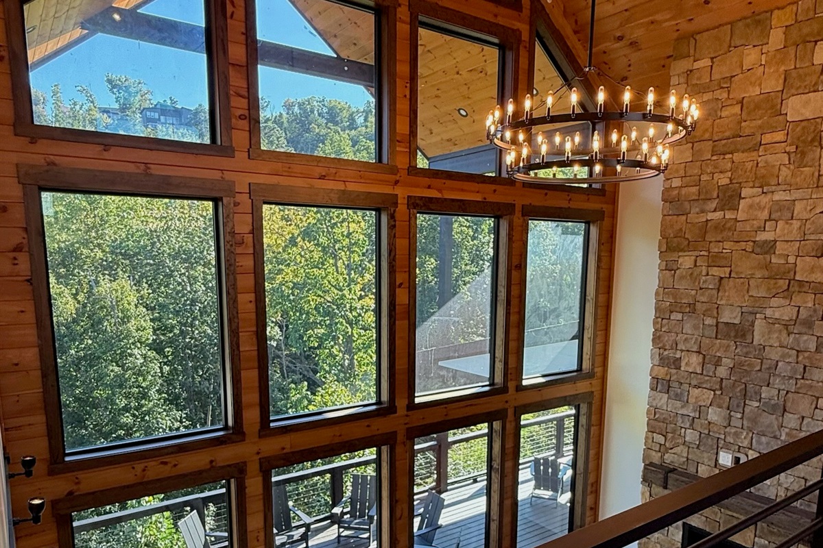 Soaring 30-foot ceilings with huge windows to bring the outdoors in; a dramatic floor-to-ceiling stone fireplace anchors the main living area, creating a warm, open space ideal for gathering with family and friends. Each of the 8 spacious bedrooms includes its own private en-suite bathroom, offering luxury and privacy for all guests. With over 8,000 square feet, there’s ample space for all.