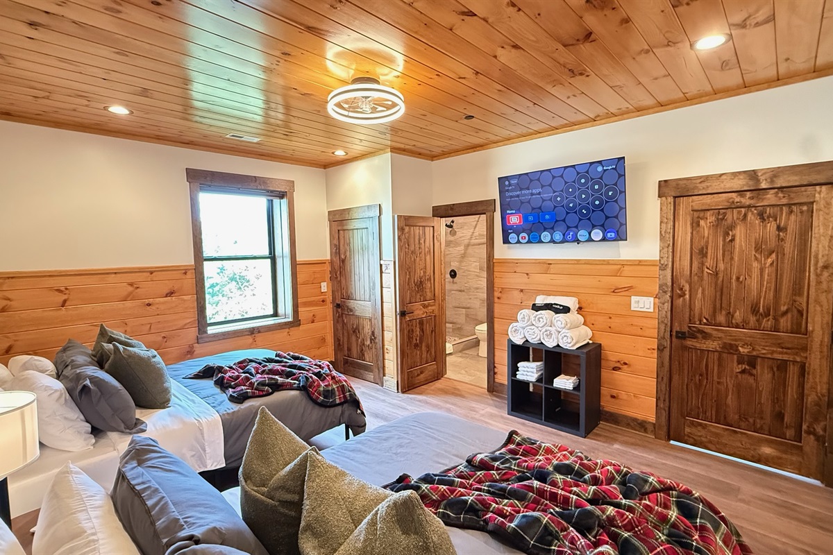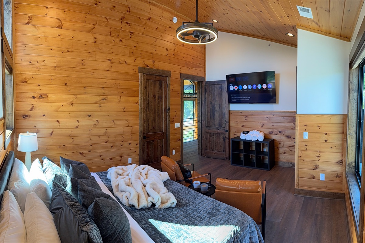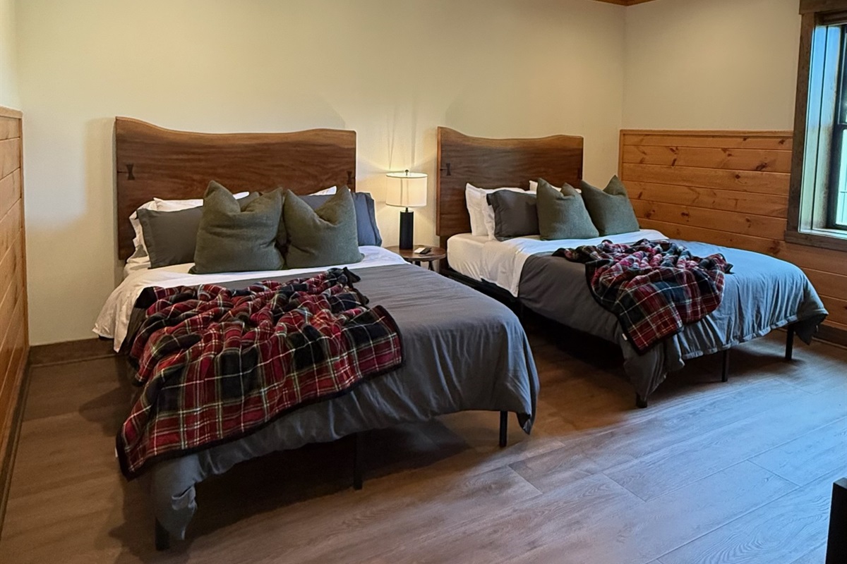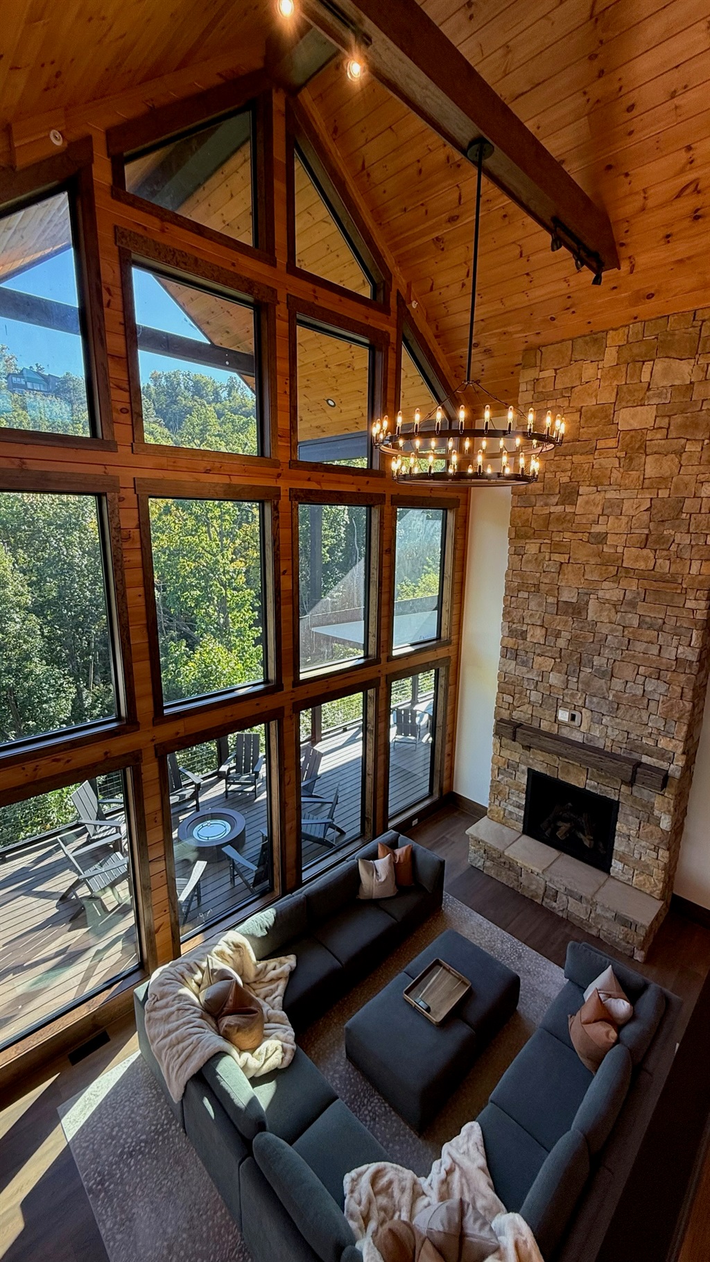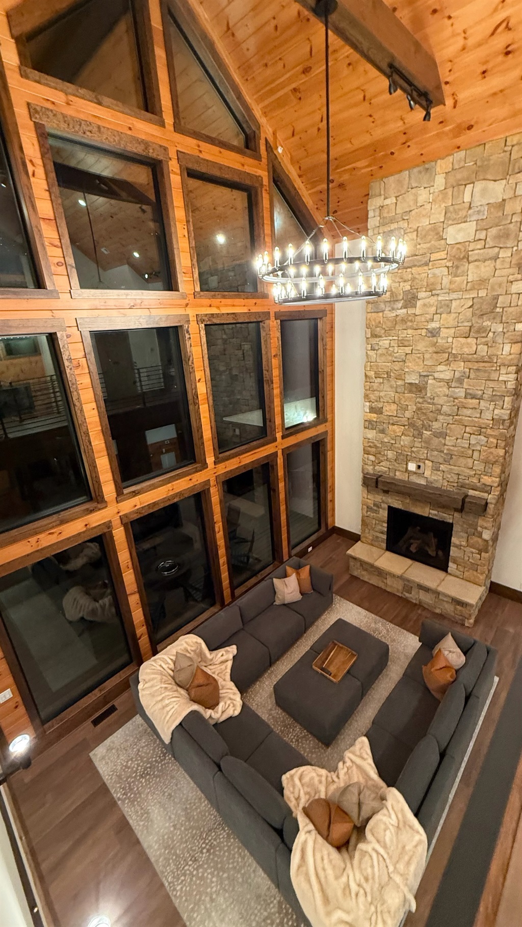 Soaring 30-foot ceilings with huge windows to bring the outdoors in; a dramatic floor-to-ceiling stone fireplace anchors the main living area, creating a warm, open space ideal for gathering with family and friends. Each of the 8 spacious bedrooms includes its own private en-suite bathroom, offering luxury and privacy for all guests. With over 8,000 square feet, there’s ample space for all.
