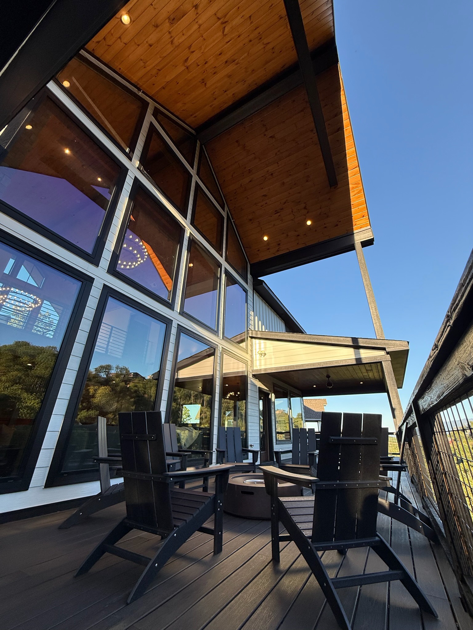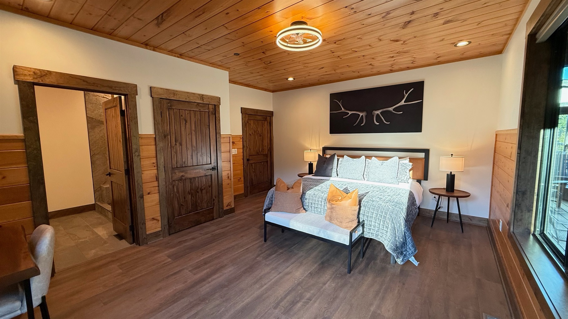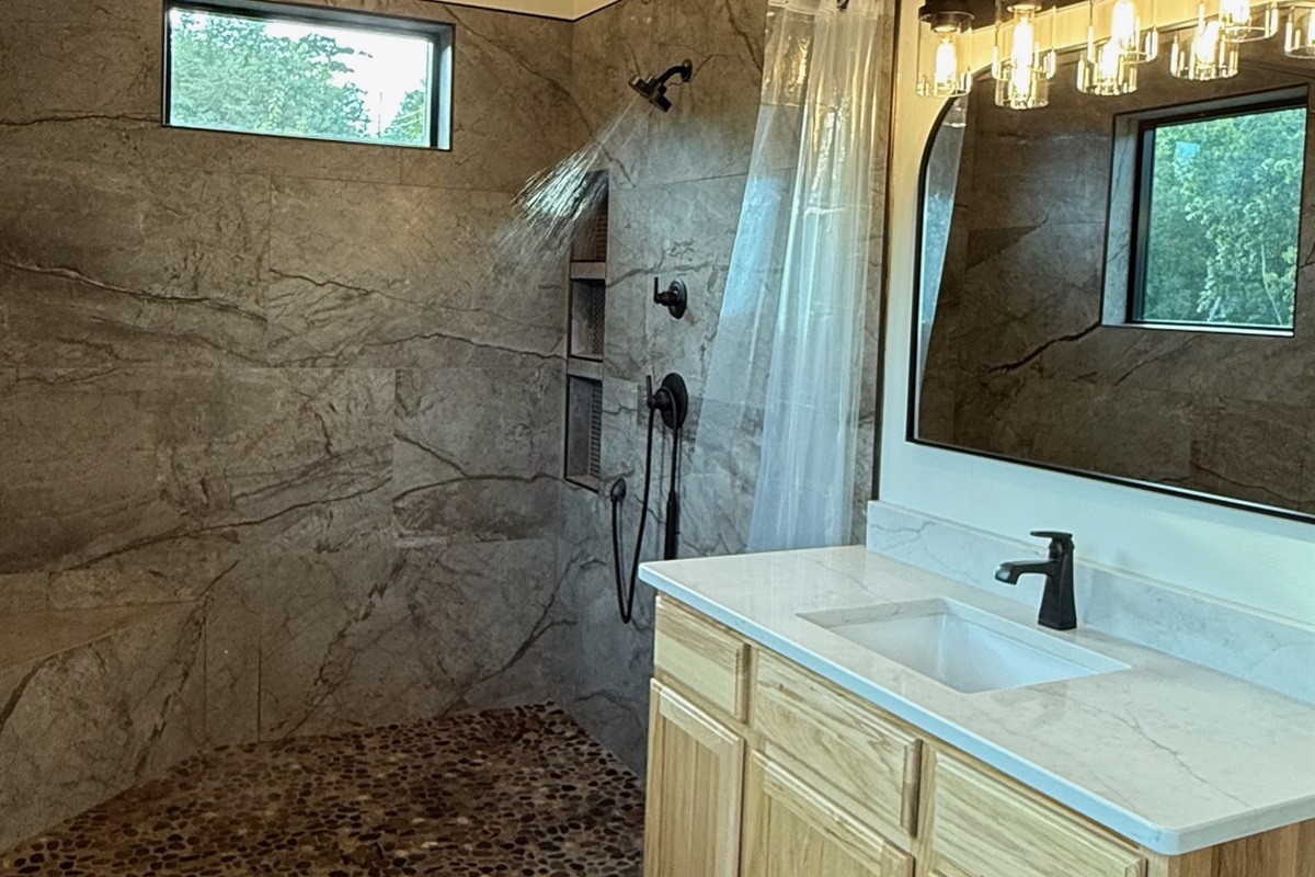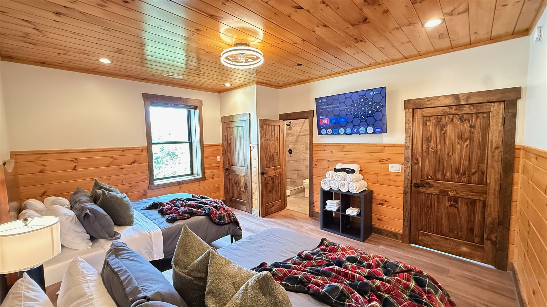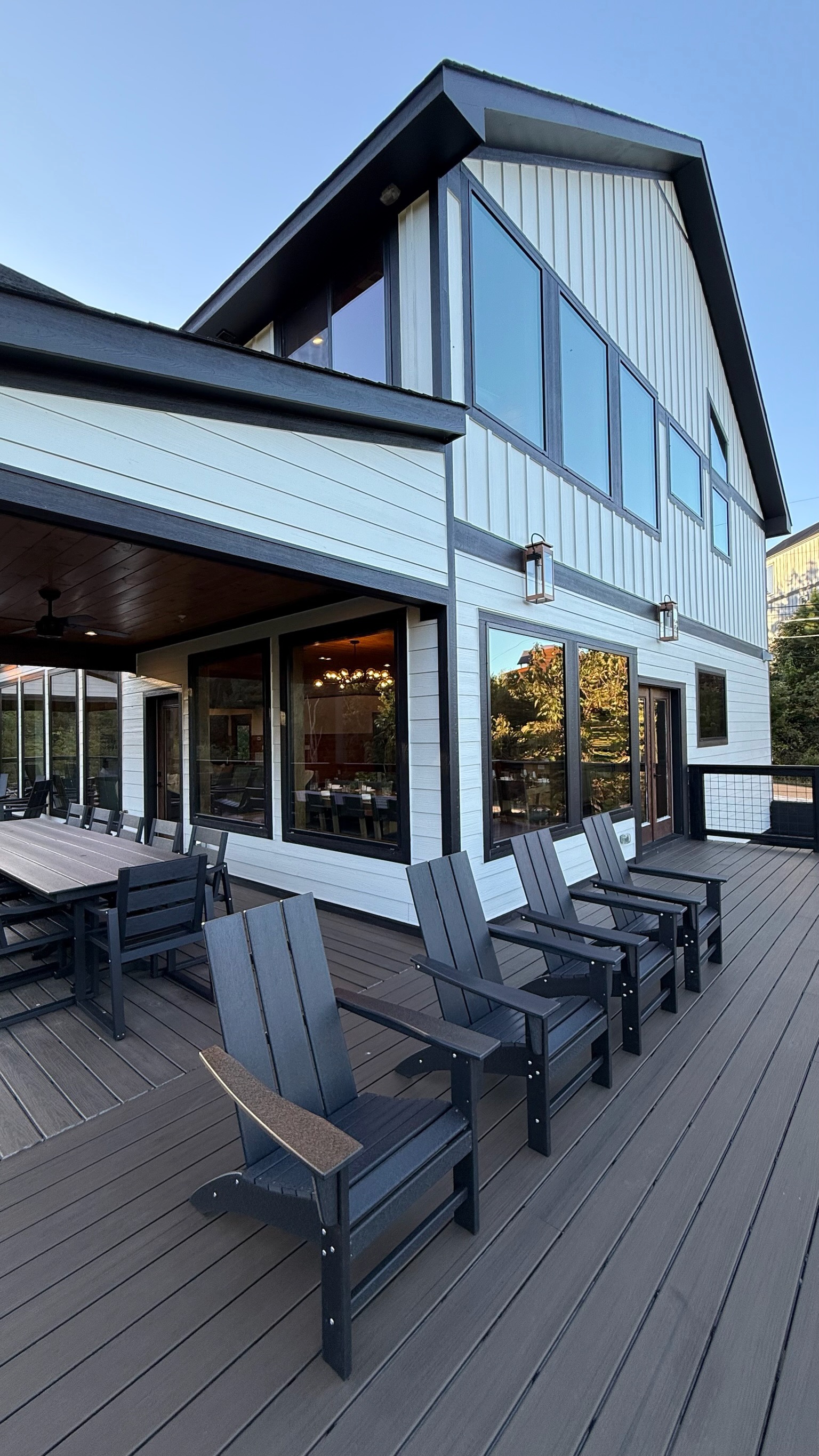 Soaring 30-foot ceilings with huge windows to bring the outdoors in; a dramatic floor-to-ceiling stone fireplace anchors the main living area, creating a warm, open space ideal for gathering with family and friends. Each of the 8 spacious bedrooms includes its own private en-suite bathroom, offering luxury and privacy for all guests. With over 8,000 square feet, there’s ample space for all.