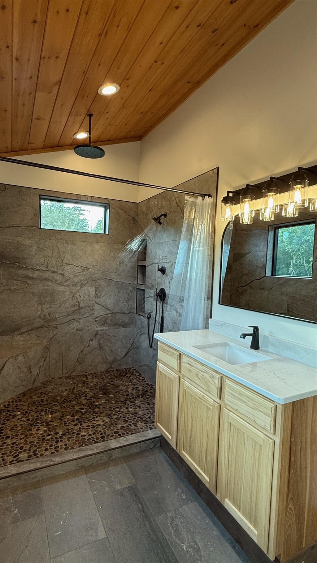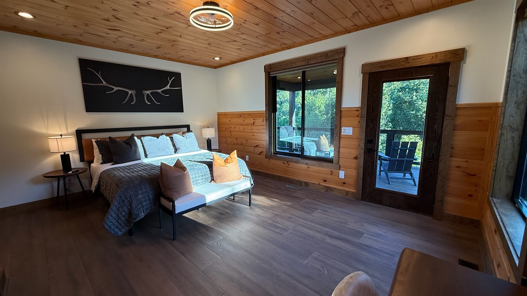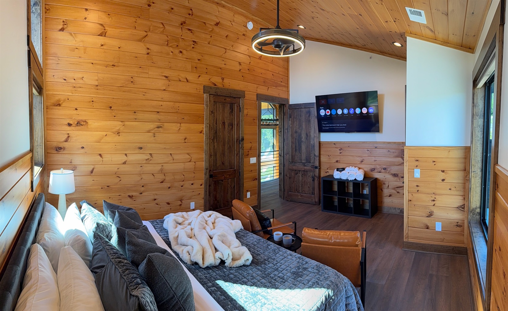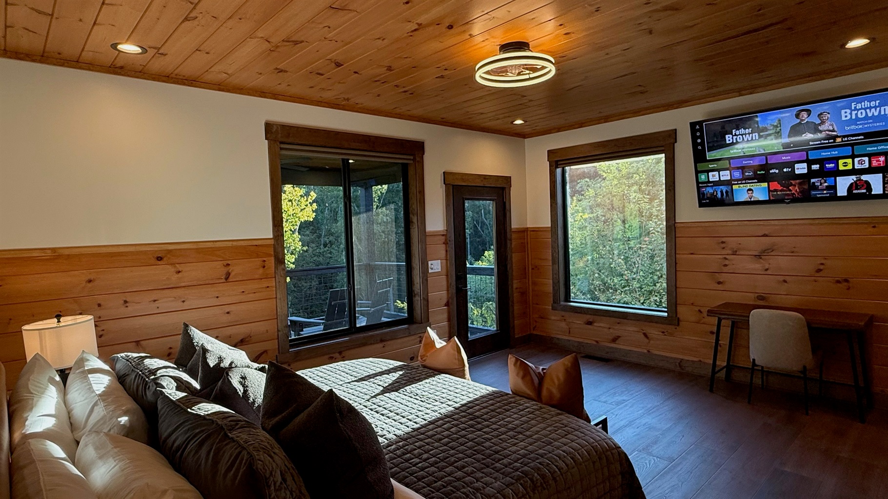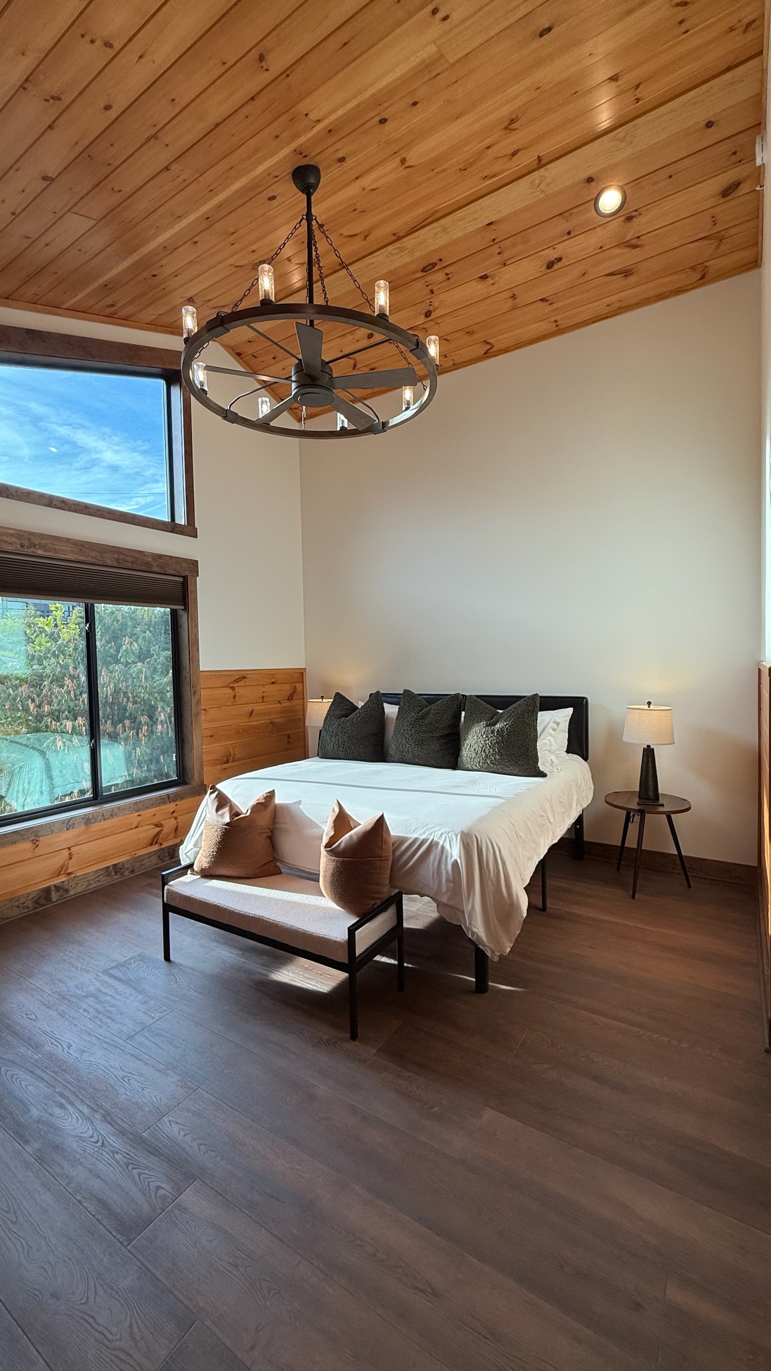 Soaring 30-foot ceilings with huge windows to bring the outdoors in; a dramatic floor-to-ceiling stone fireplace anchors the main living area, creating a warm, open space ideal for gathering with family and friends. Each of the 8 spacious bedrooms includes its own private en-suite bathroom, offering luxury and privacy for all guests. With over 8,000 square feet, there’s ample space for all.