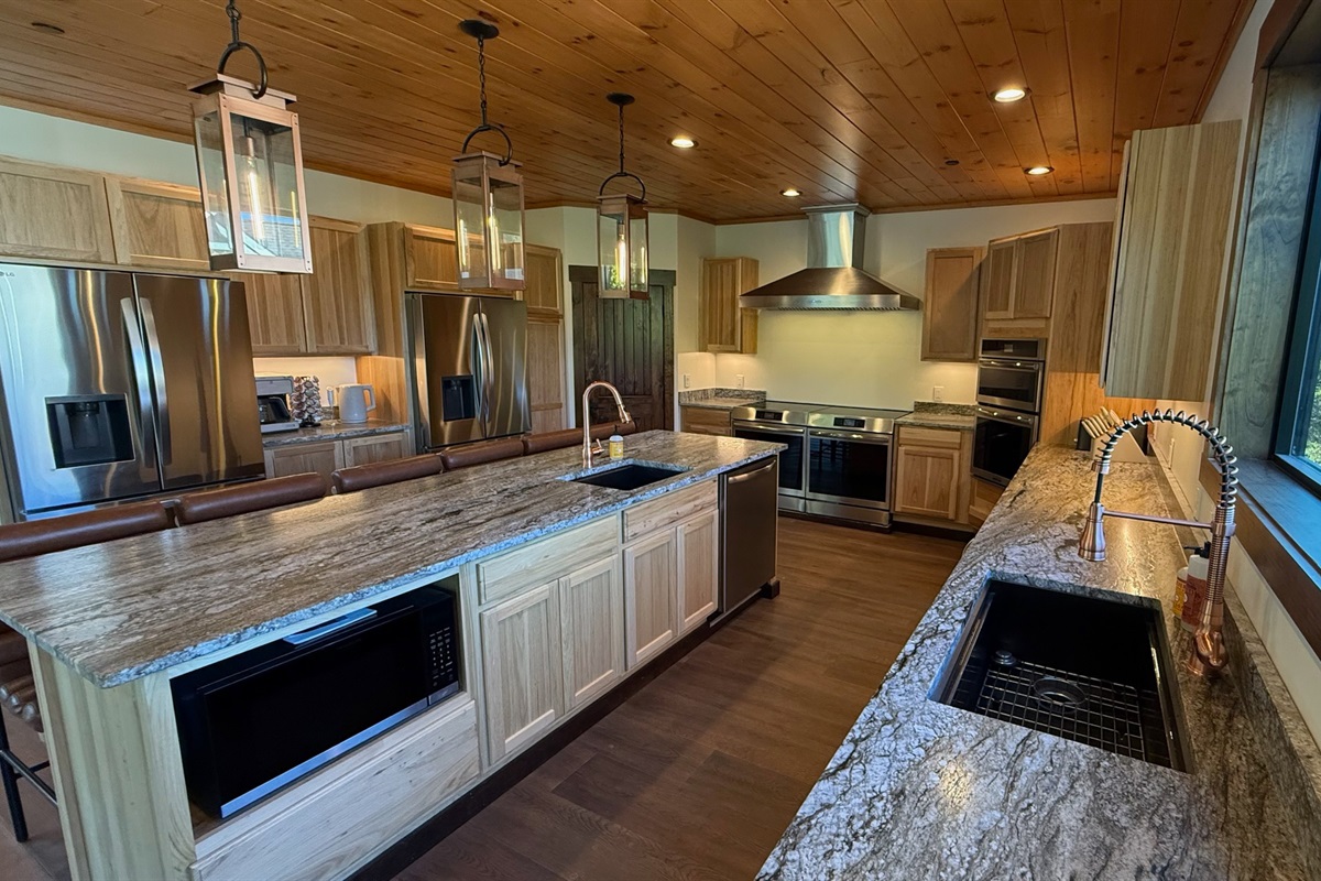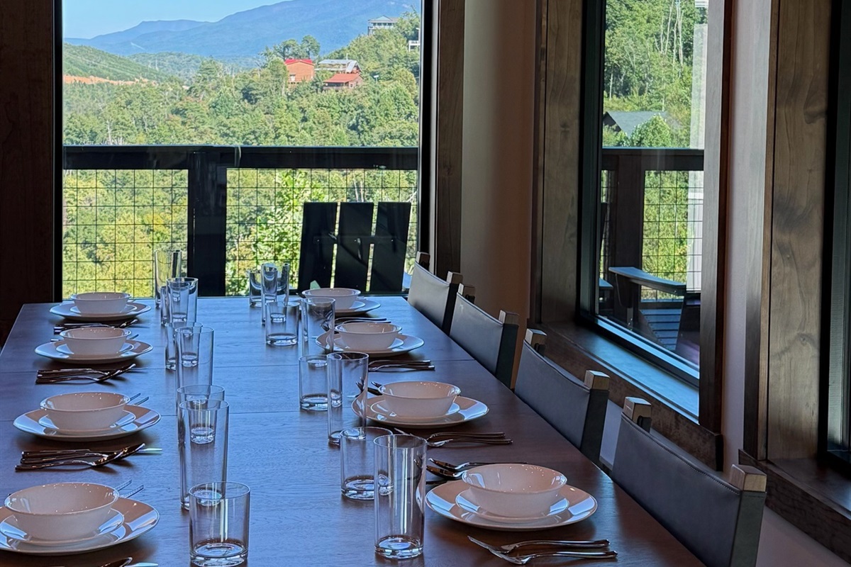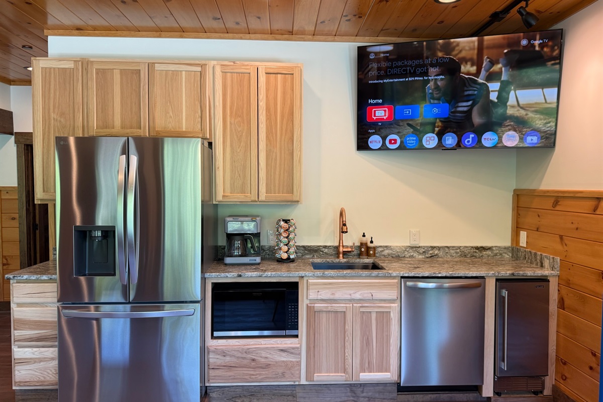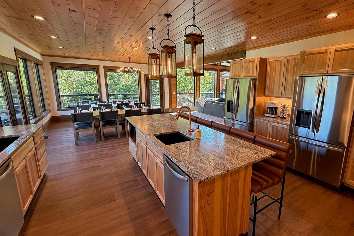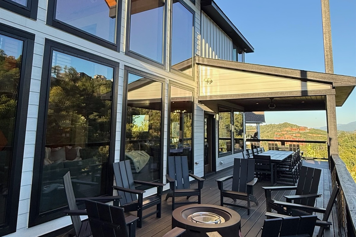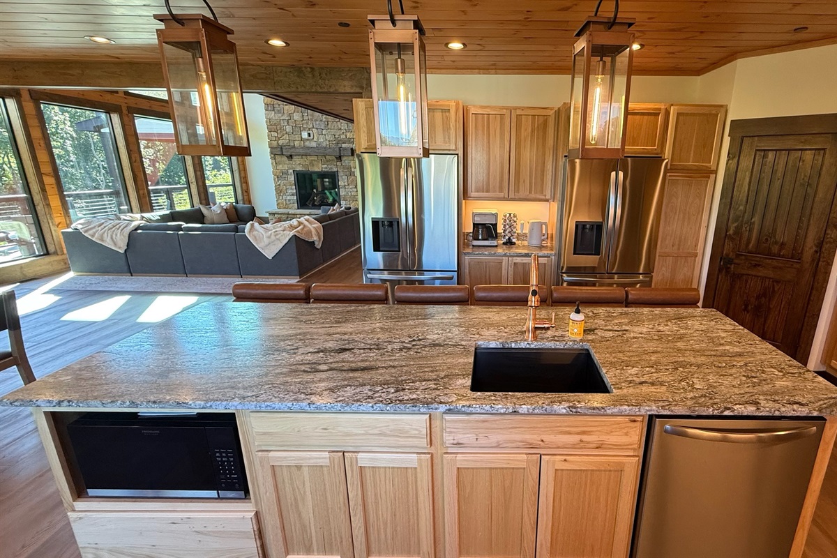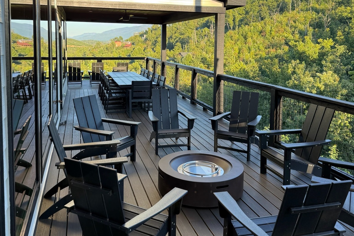 The heart of the home is the fully stocked chef’s kitchen, thoughtfully designed for large groups and entertaining. It features 2 full-size refrigerators, 4 ovens, 2 dishwashers, 2 sinks, 2 microwaves, and a dedicated coffee bar, ensuring you have everything you need to prepare and enjoy meals with ease. On another floor, a separate kitchenette features a third full-size refrigerator, dishwasher, microwave, sink, coffee bar and high output ice maker, add even more convenience. No need to buy ice for your coolers for the outing into the National Park or Dollywood. With dining seating for the entire group, shared meals become memorable experiences—whether indoors or on the expansive wrap-around covered deck with breathtaking mountain views. Sit around the fire table, relax and enjoy the privacy, trees and mountains with family and friends.