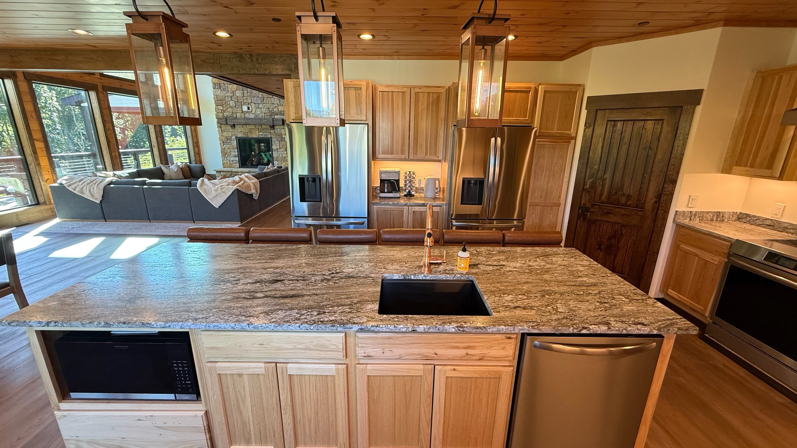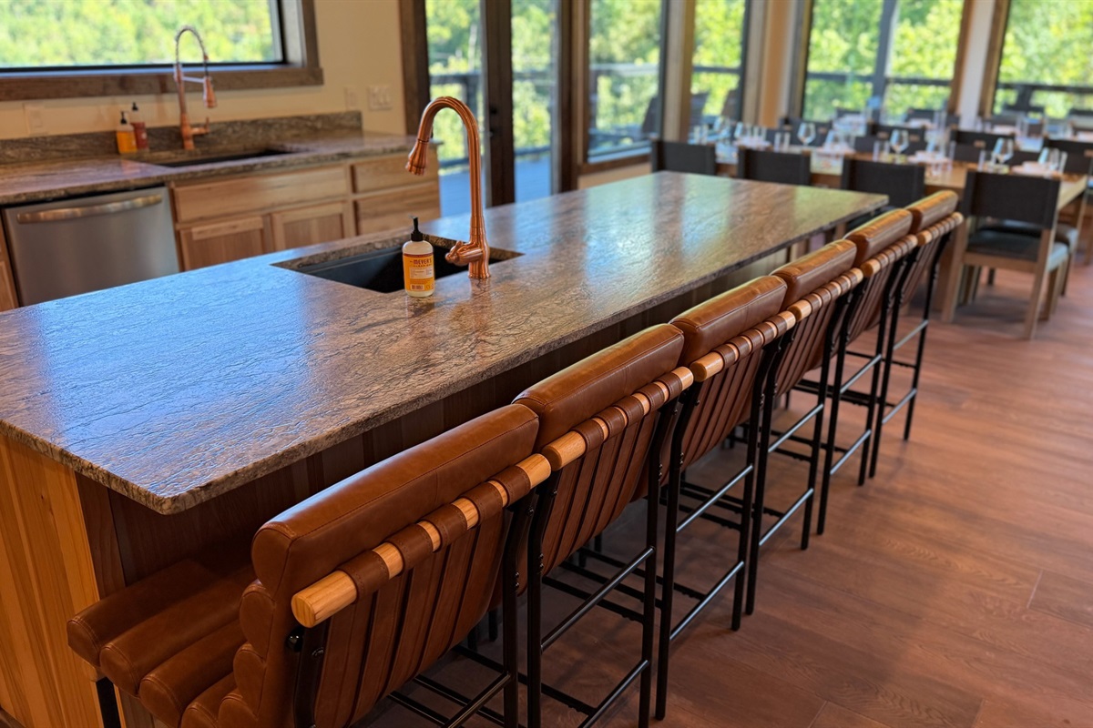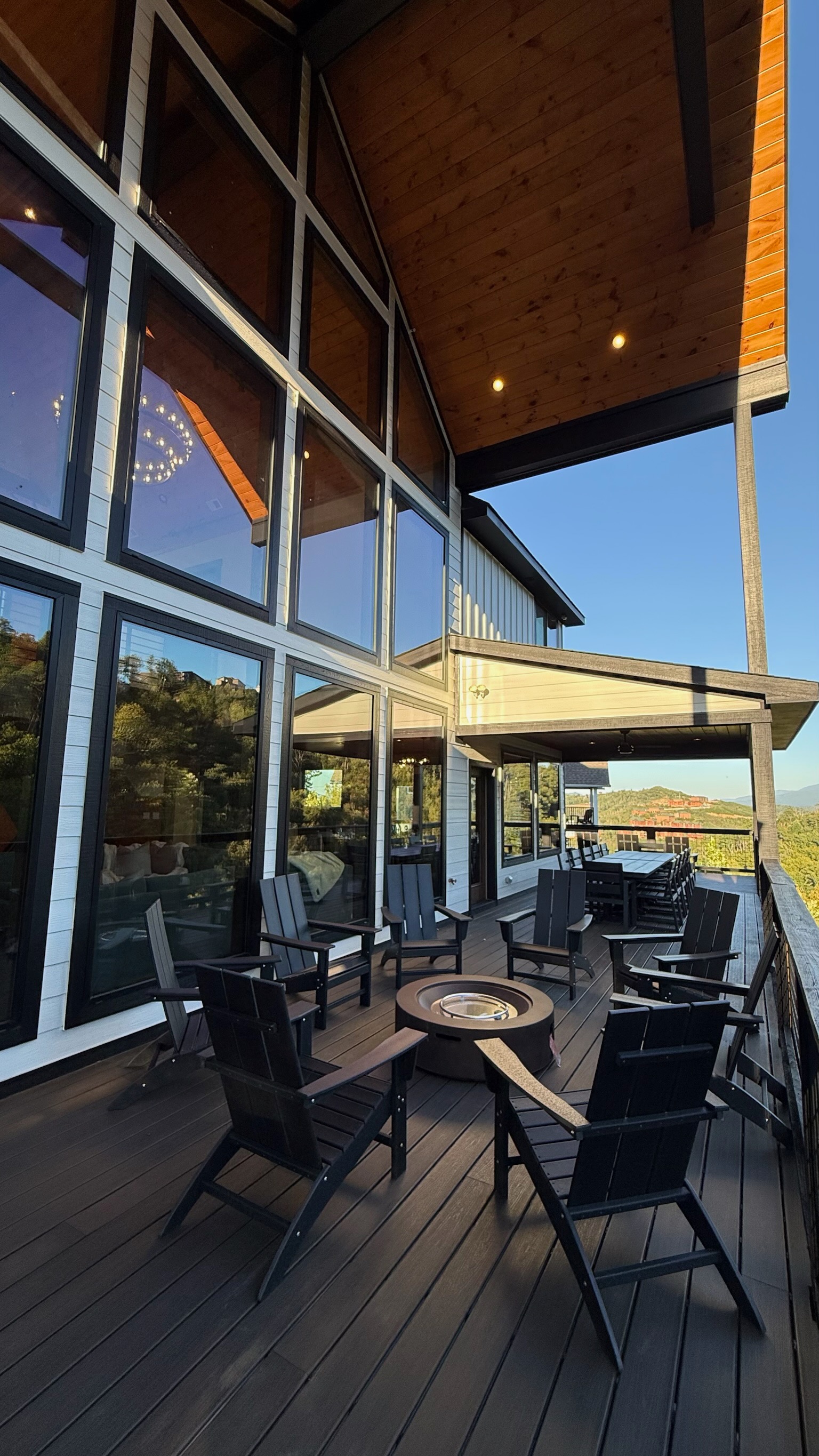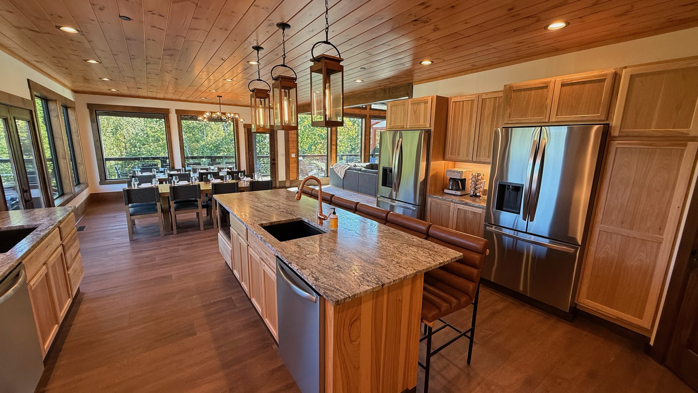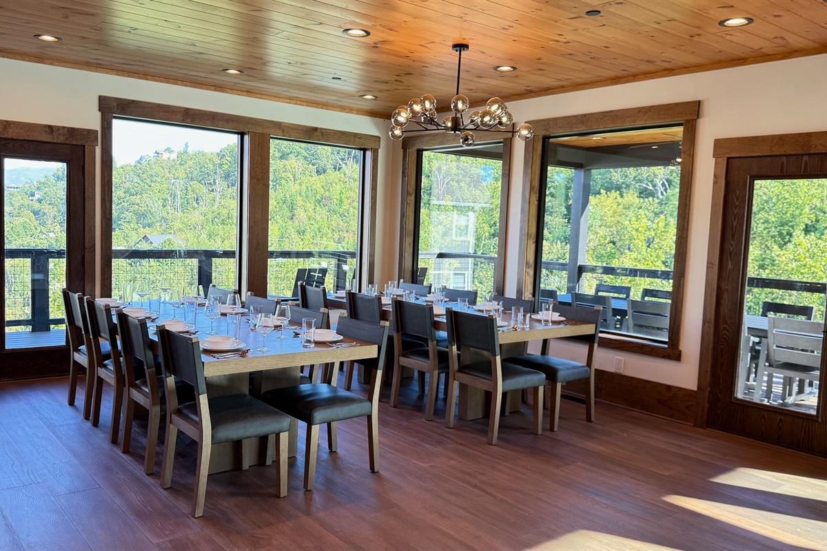 The heart of the home is the fully stocked chef’s kitchen, thoughtfully designed for large groups and entertaining. It features 2 full-size refrigerators, 4 ovens, 2 dishwashers, 2 sinks, 2 microwaves, and a dedicated coffee bar, ensuring you have everything you need to prepare and enjoy meals with ease. On another floor, a separate kitchenette features a third full-size refrigerator, dishwasher, microwave, sink, coffee bar and high output ice maker, add even more convenience. No need to buy ice for your coolers for the outing into the National Park or Dollywood. With dining seating for the entire group, shared meals become memorable experiences—whether indoors or on the expansive wrap-around covered deck with breathtaking mountain views. Sit around the fire table, relax and enjoy the privacy, trees and mountains with family and friends.