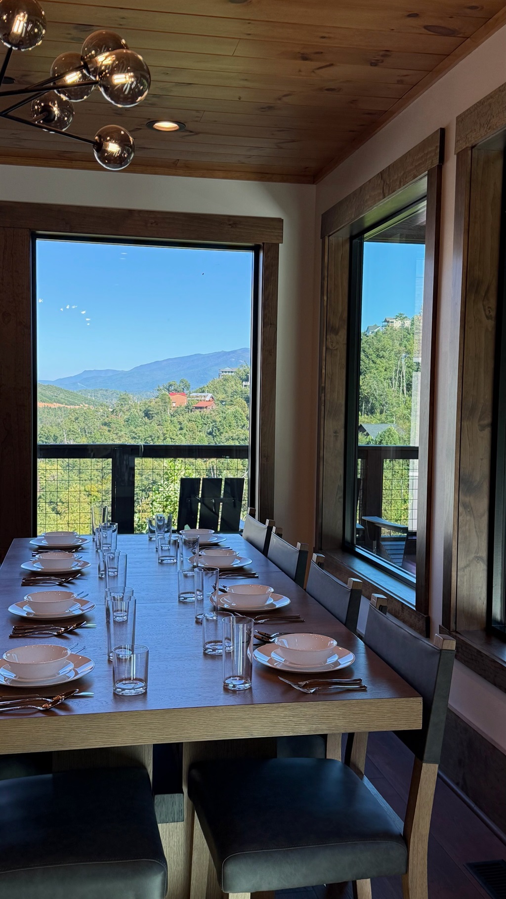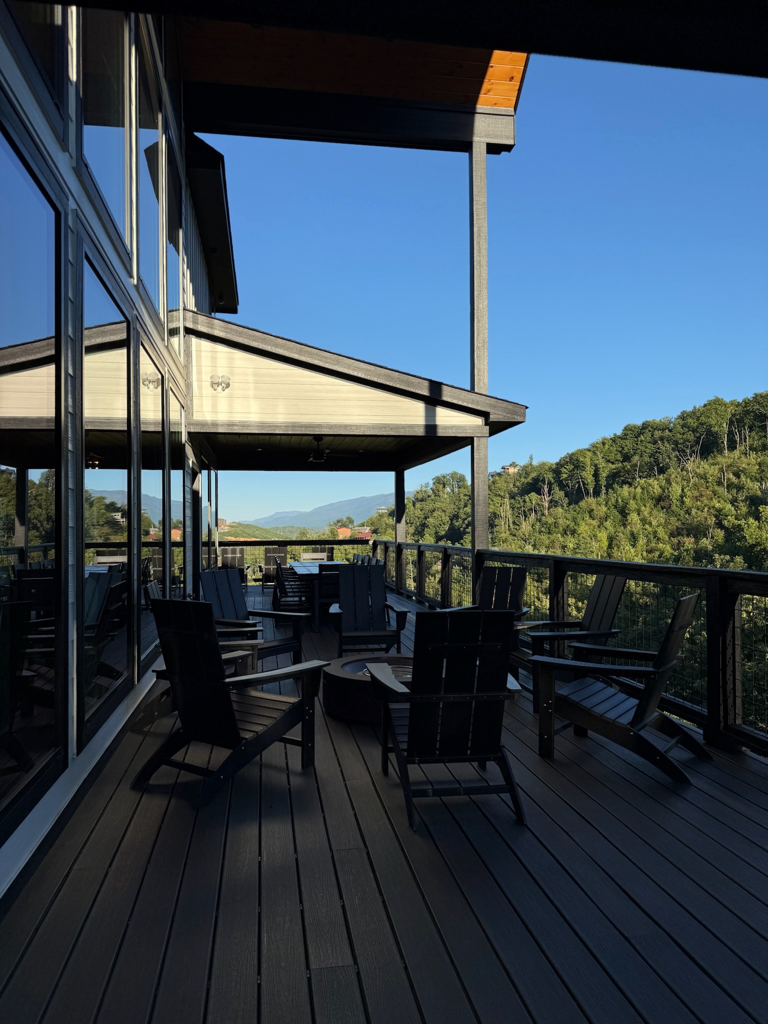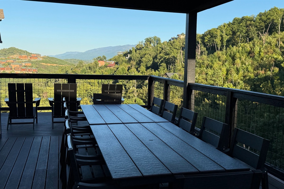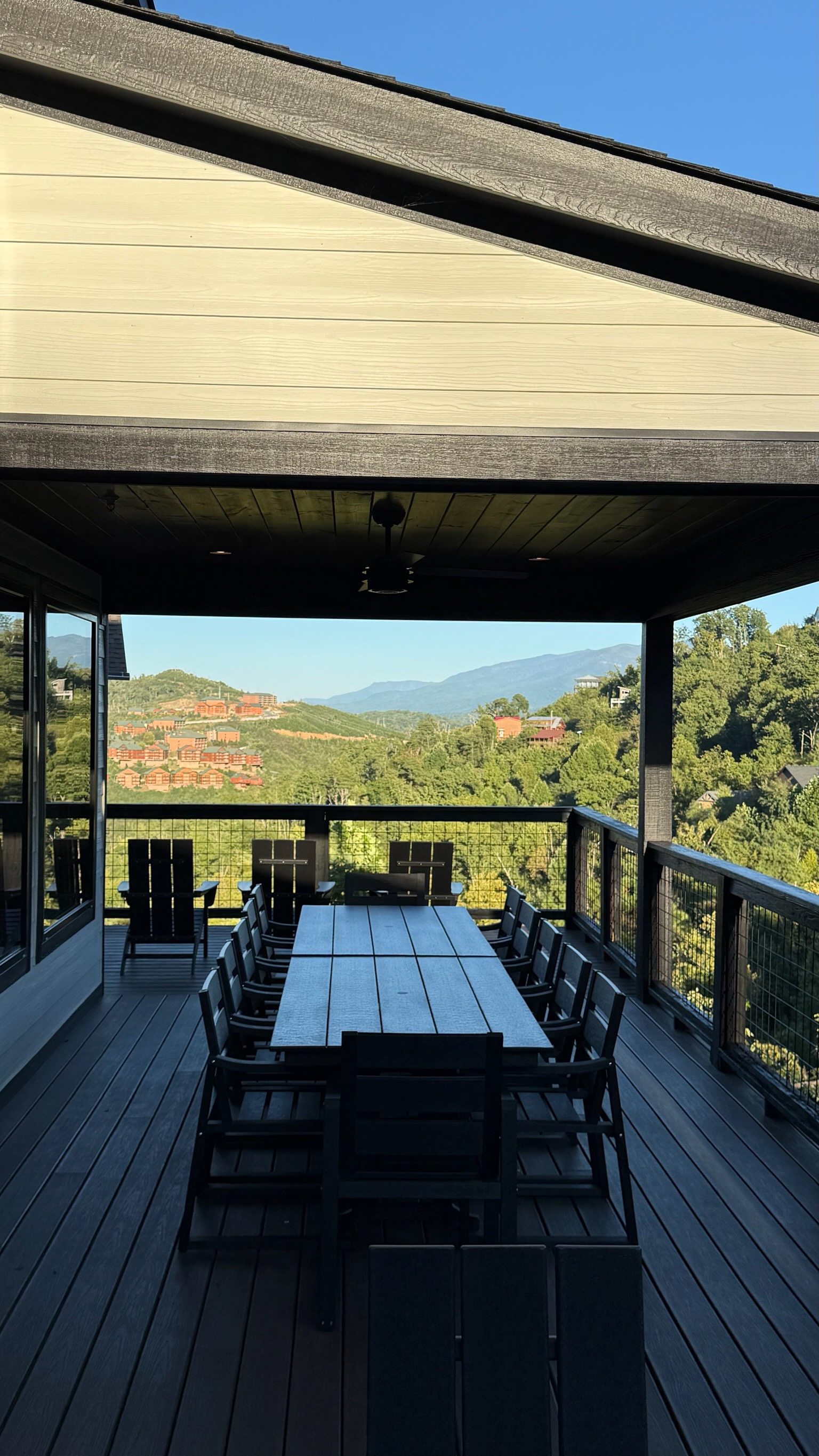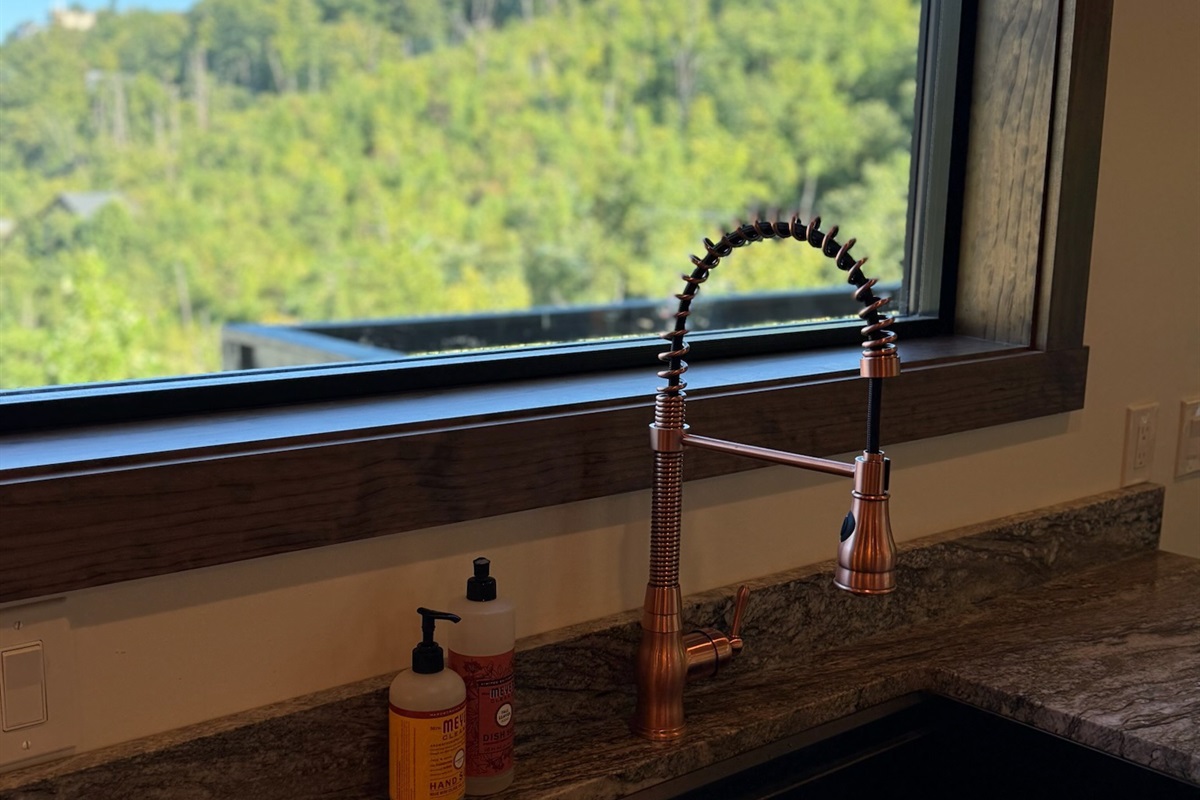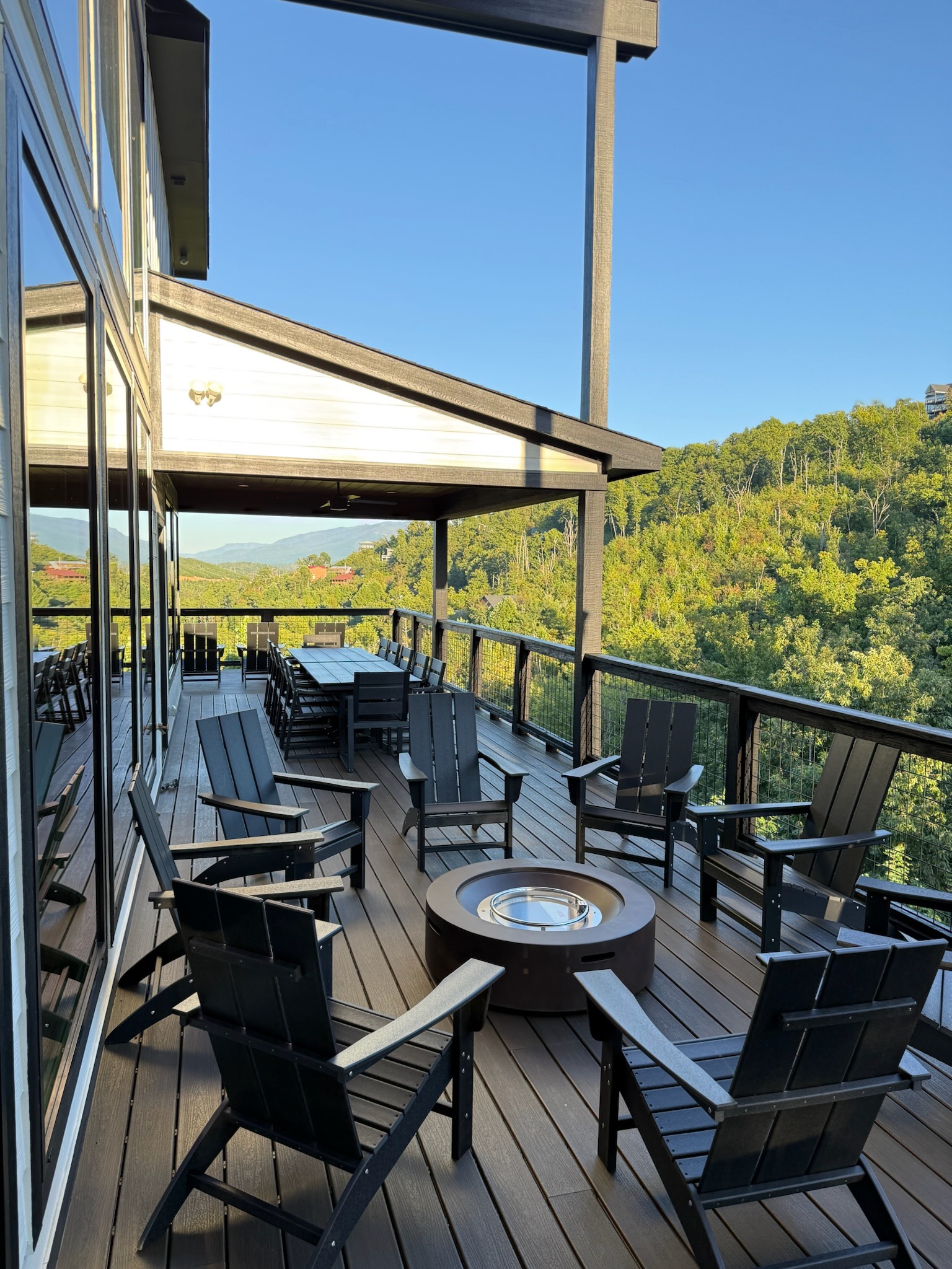 The heart of the home is the fully stocked chef’s kitchen, thoughtfully designed for large groups and entertaining. It features 2 full-size refrigerators, 4 ovens, 2 dishwashers, 2 sinks, 2 microwaves, and a dedicated coffee bar, ensuring you have everything you need to prepare and enjoy meals with ease. On another floor, a separate kitchenette features a third full-size refrigerator, dishwasher, microwave, sink, coffee bar and high output ice maker, add even more convenience. No need to buy ice for your coolers for the outing into the National Park or Dollywood. With dining seating for the entire group, shared meals become memorable experiences—whether indoors or on the expansive wrap-around covered deck with breathtaking mountain views. Sit around the fire table, relax and enjoy the privacy, trees and mountains with family and friends.