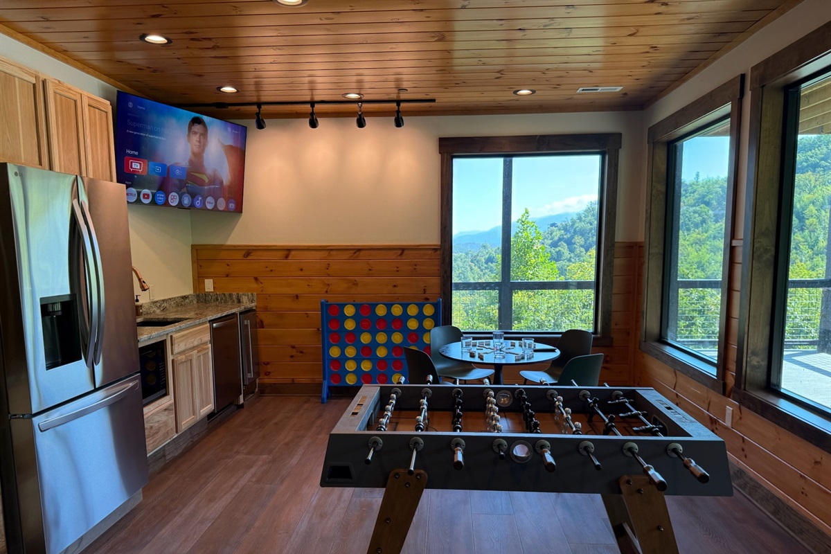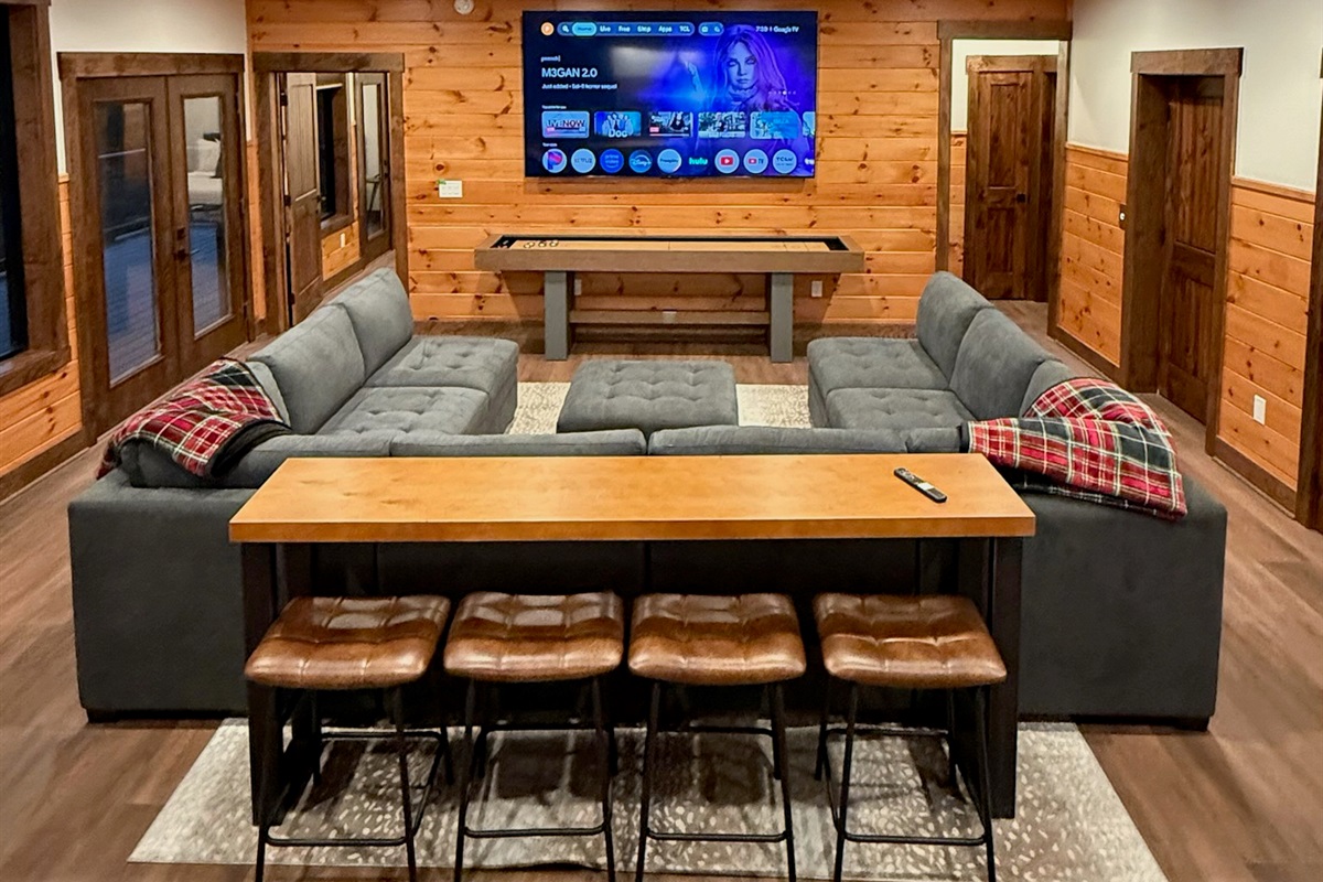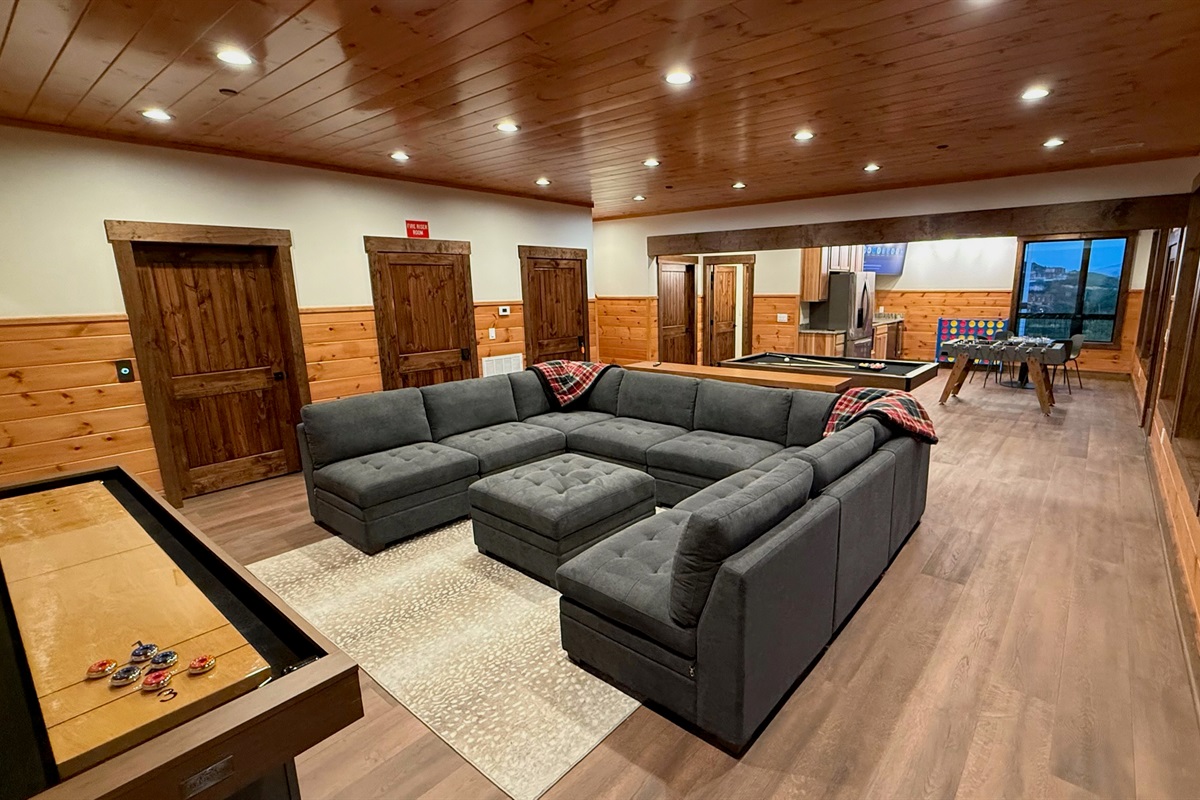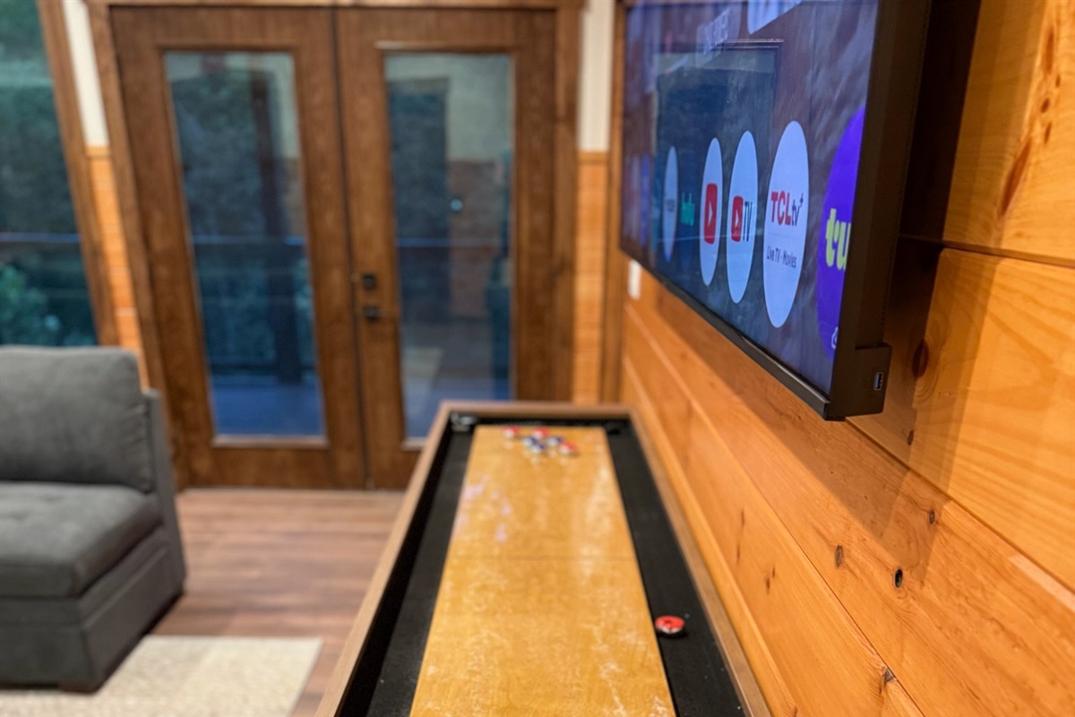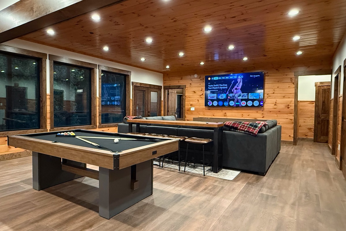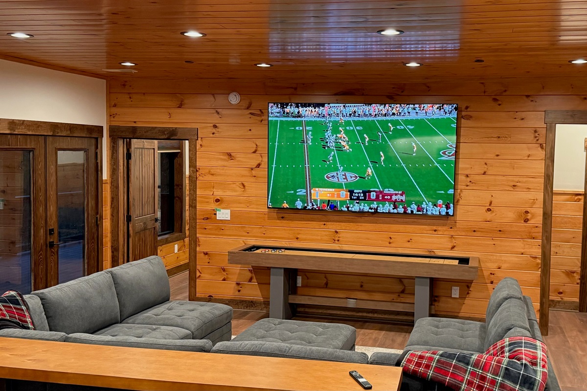 Entertainment and relaxation abound. The spacious game room features a massive 100-inch TV and a plush large sectional sofa perfect for movie nights and game days. Plus the classics all love, pool table, shuffleboard, foosball and a table to play poker or boardgames. Step just outside the gameroom onto the lower level expansive deck and play cornhole, unwind in the outdoor hot tub, or just relax in an adirondack chair soaking up the Smoky Mountain air.
