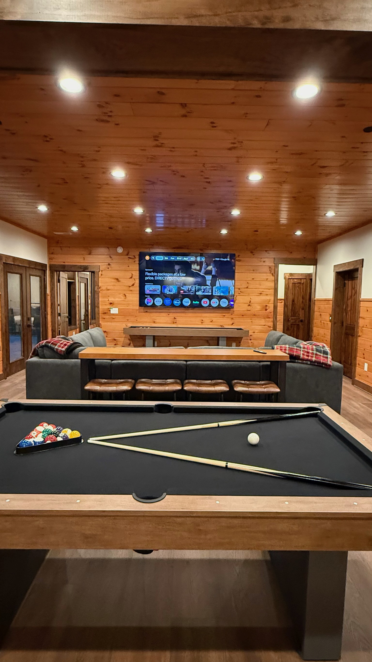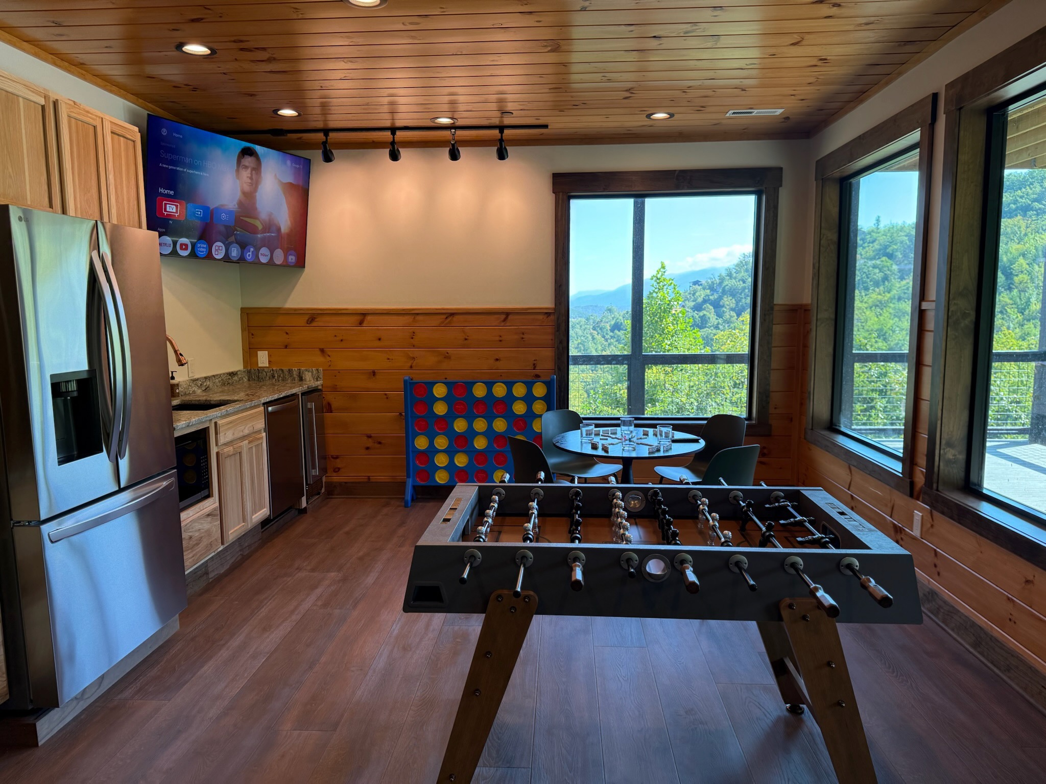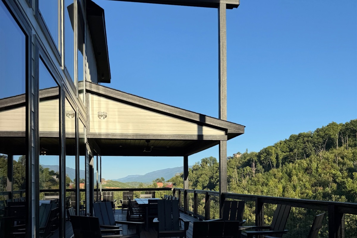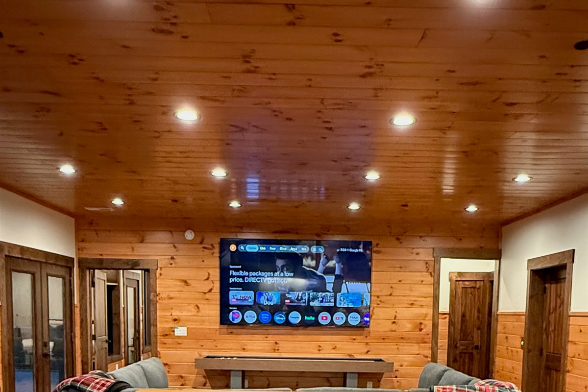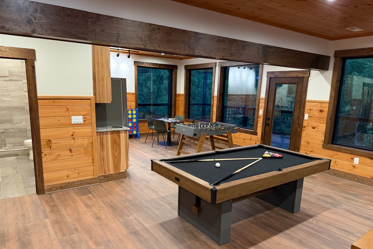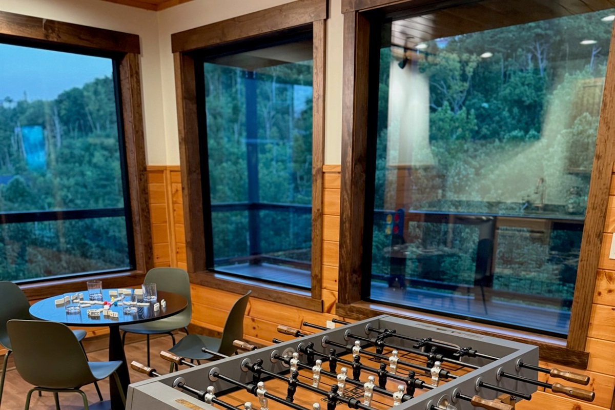 Entertainment and relaxation abound. The spacious game room features a massive 100-inch TV and a plush large sectional sofa perfect for movie nights and game days. Plus the classics all love, pool table, shuffleboard, foosball and a table to play poker or boardgames. Step just outside the gameroom onto the lower level expansive deck and play cornhole, unwind in the outdoor hot tub, or just relax in an adirondack chair soaking up the Smoky Mountain air.