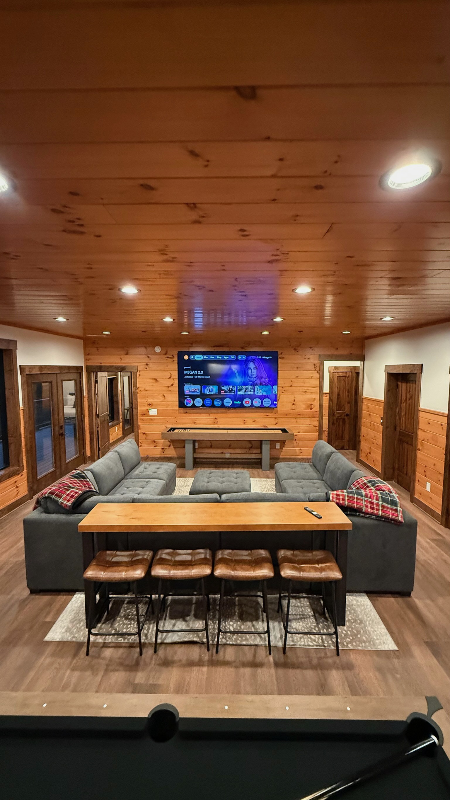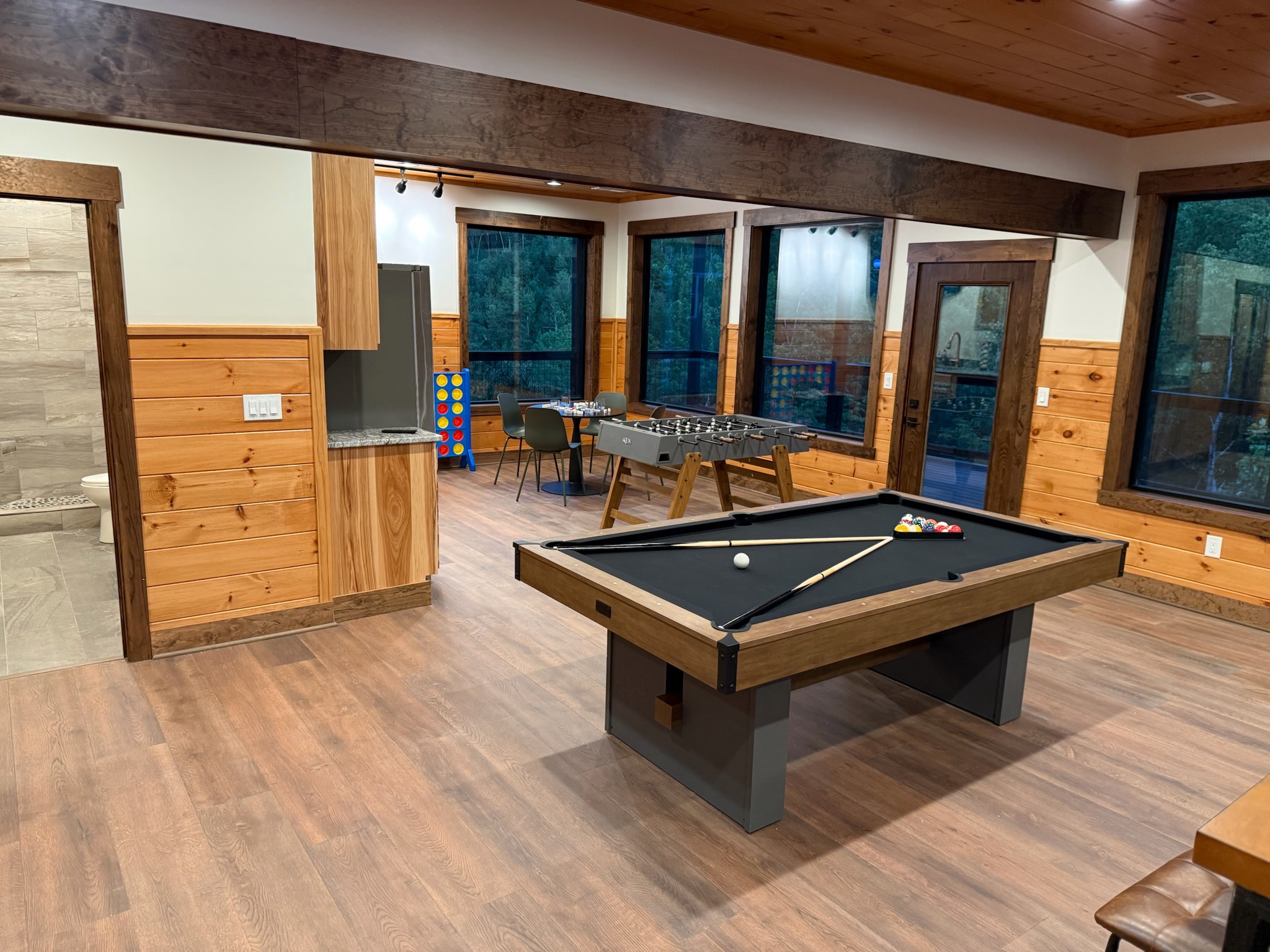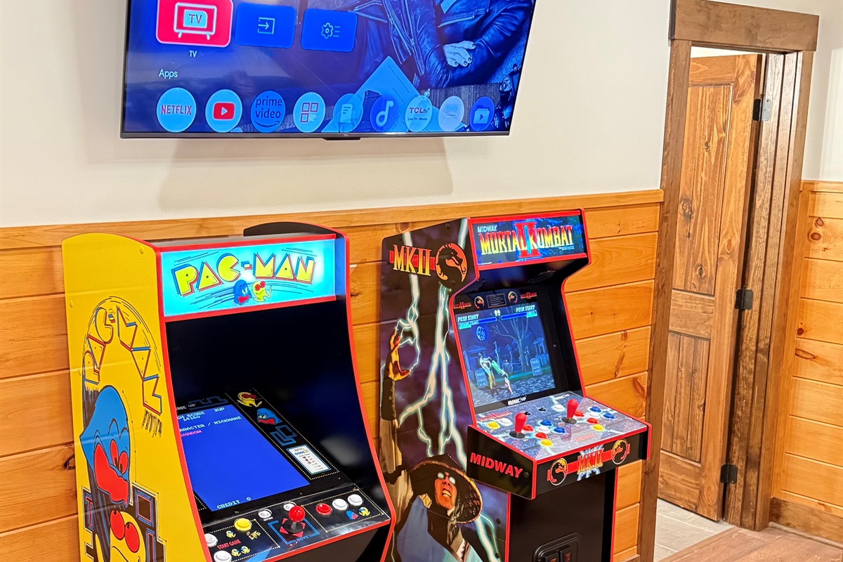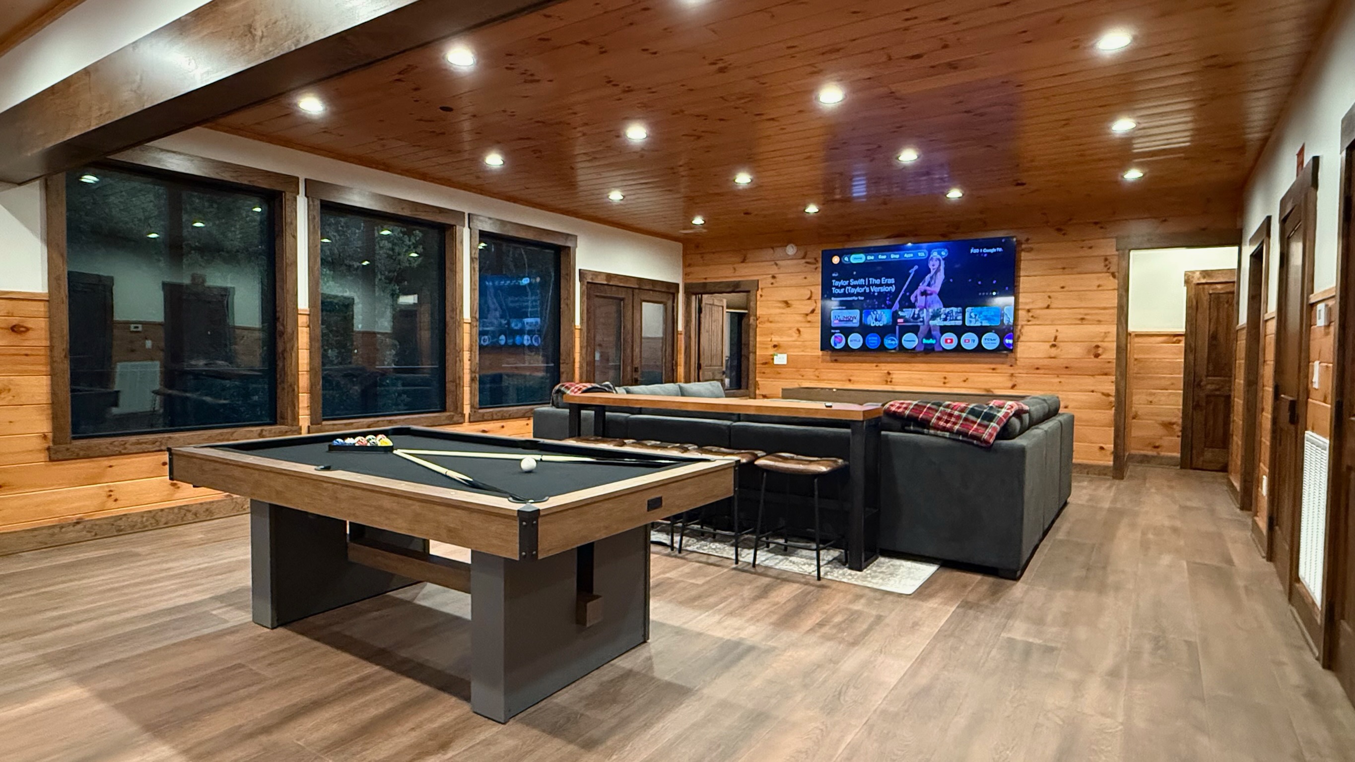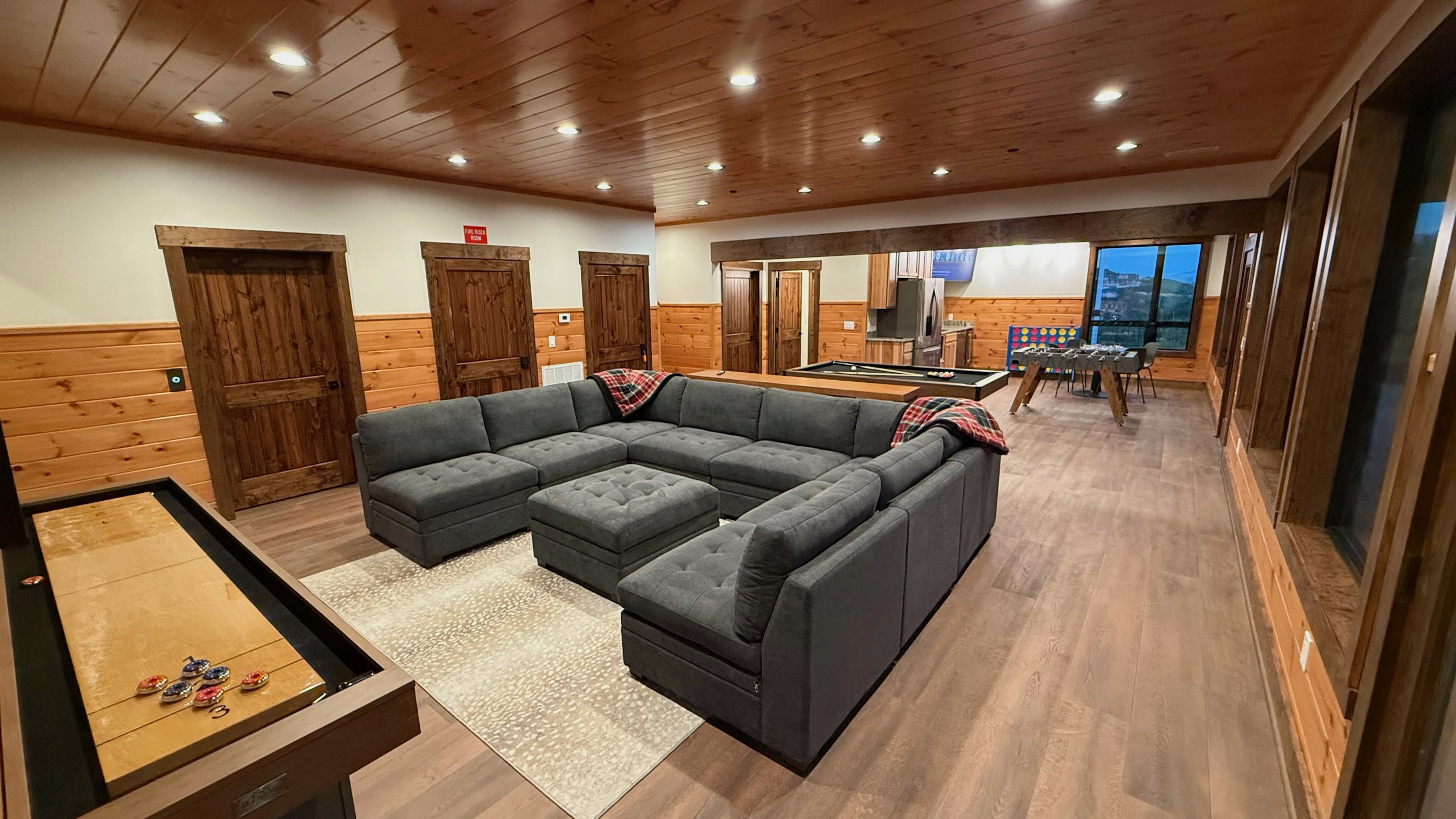 Entertainment and relaxation abound. The spacious game room features a massive 100-inch TV and a plush large sectional sofa perfect for movie nights and game days. Plus the classics all love, pool table, shuffleboard, foosball and a table to play poker or boardgames. Step just outside the gameroom onto the lower level expansive deck and play cornhole, unwind in the outdoor hot tub, or just relax in an adirondack chair soaking up the Smoky Mountain air.