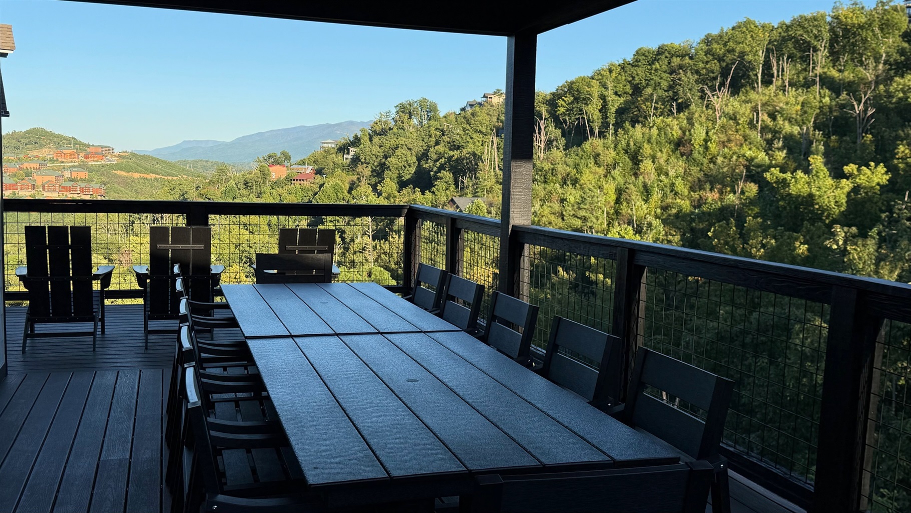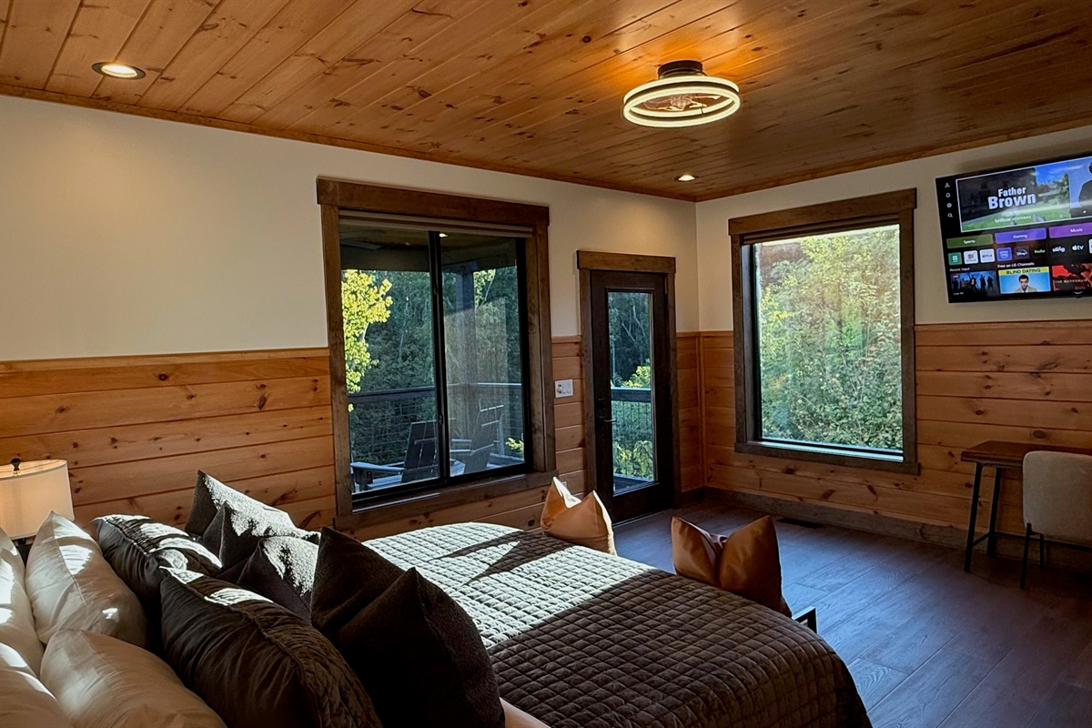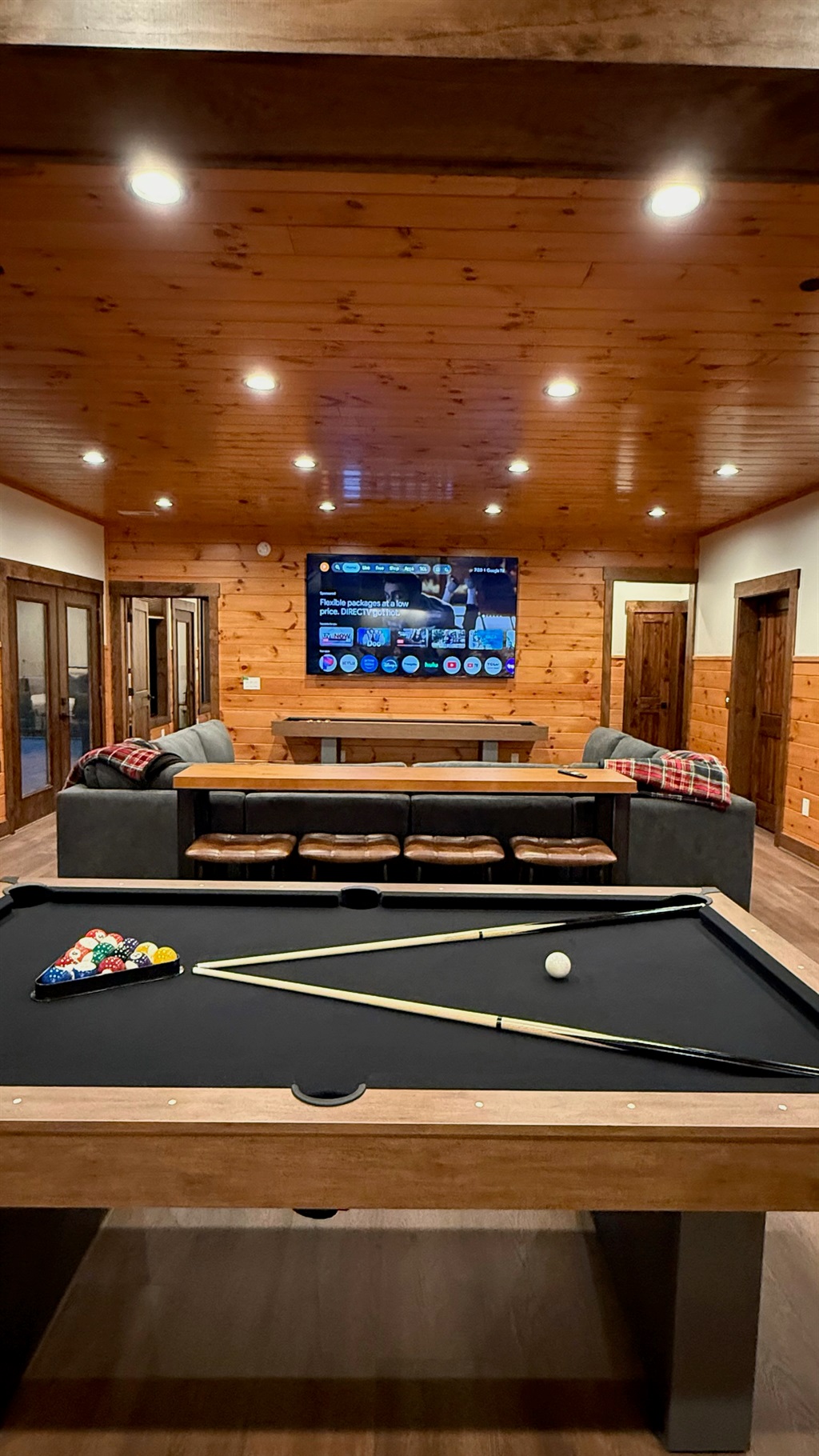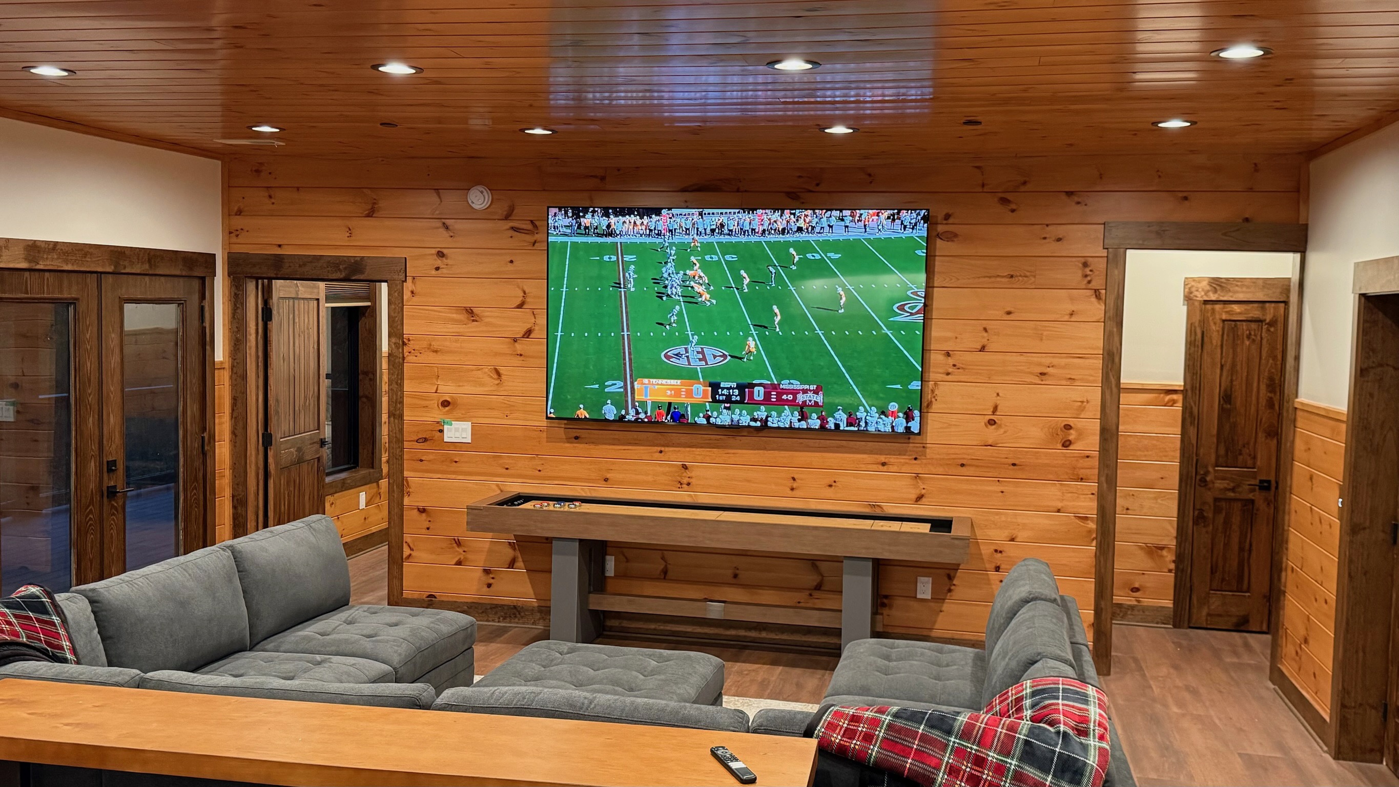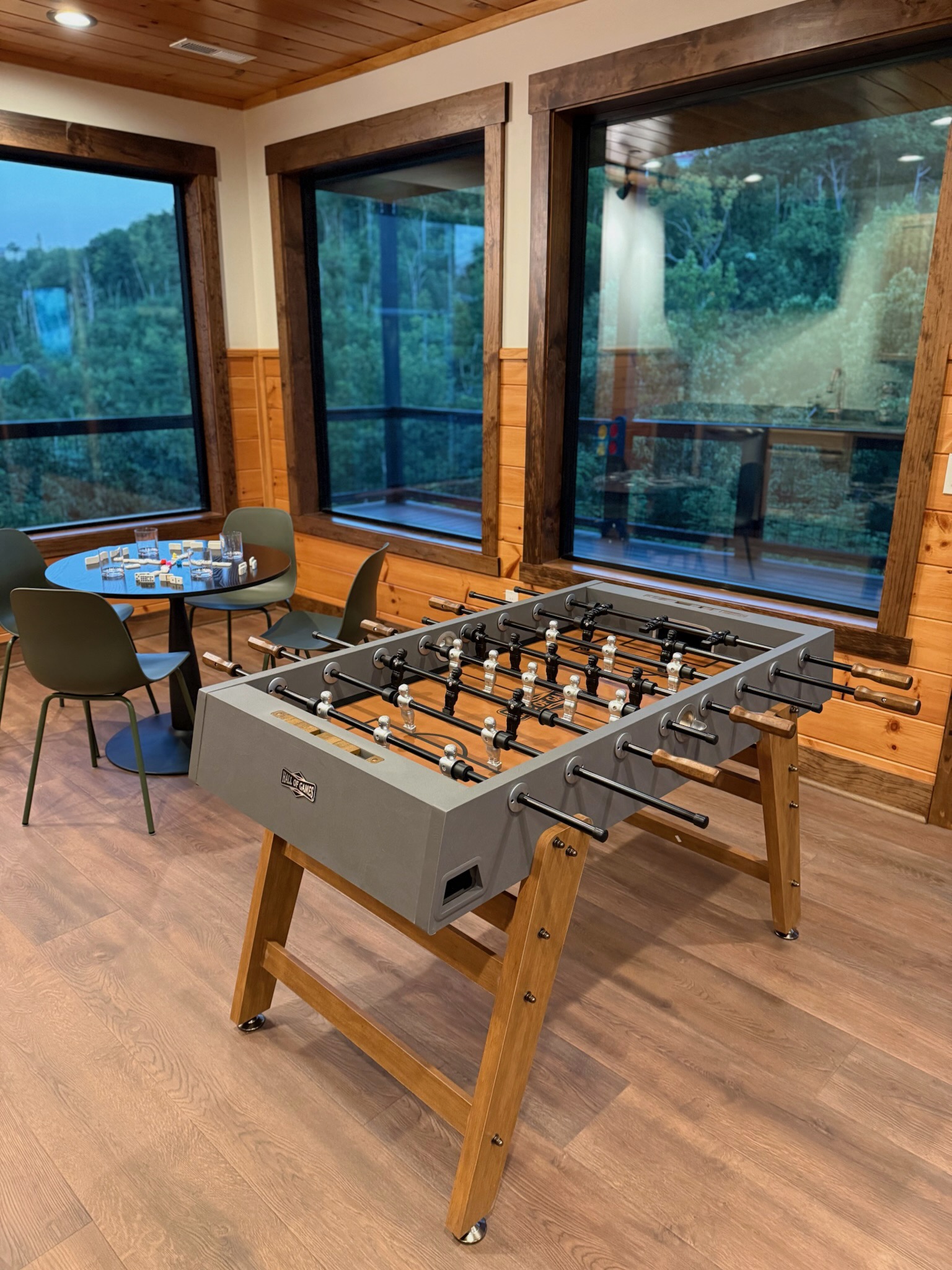 Entertainment and relaxation abound. The spacious game room features a massive 100-inch TV and a plush large sectional sofa perfect for movie nights and game days. Plus the classics all love, pool table, shuffleboard, foosball and a table to play poker or boardgames. Step just outside the gameroom onto the lower level expansive deck and play cornhole, unwind in the outdoor hot tub, or just relax in an adirondack chair soaking up the Smoky Mountain air.