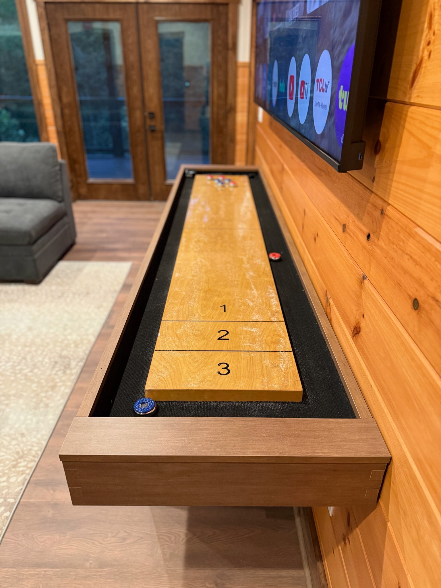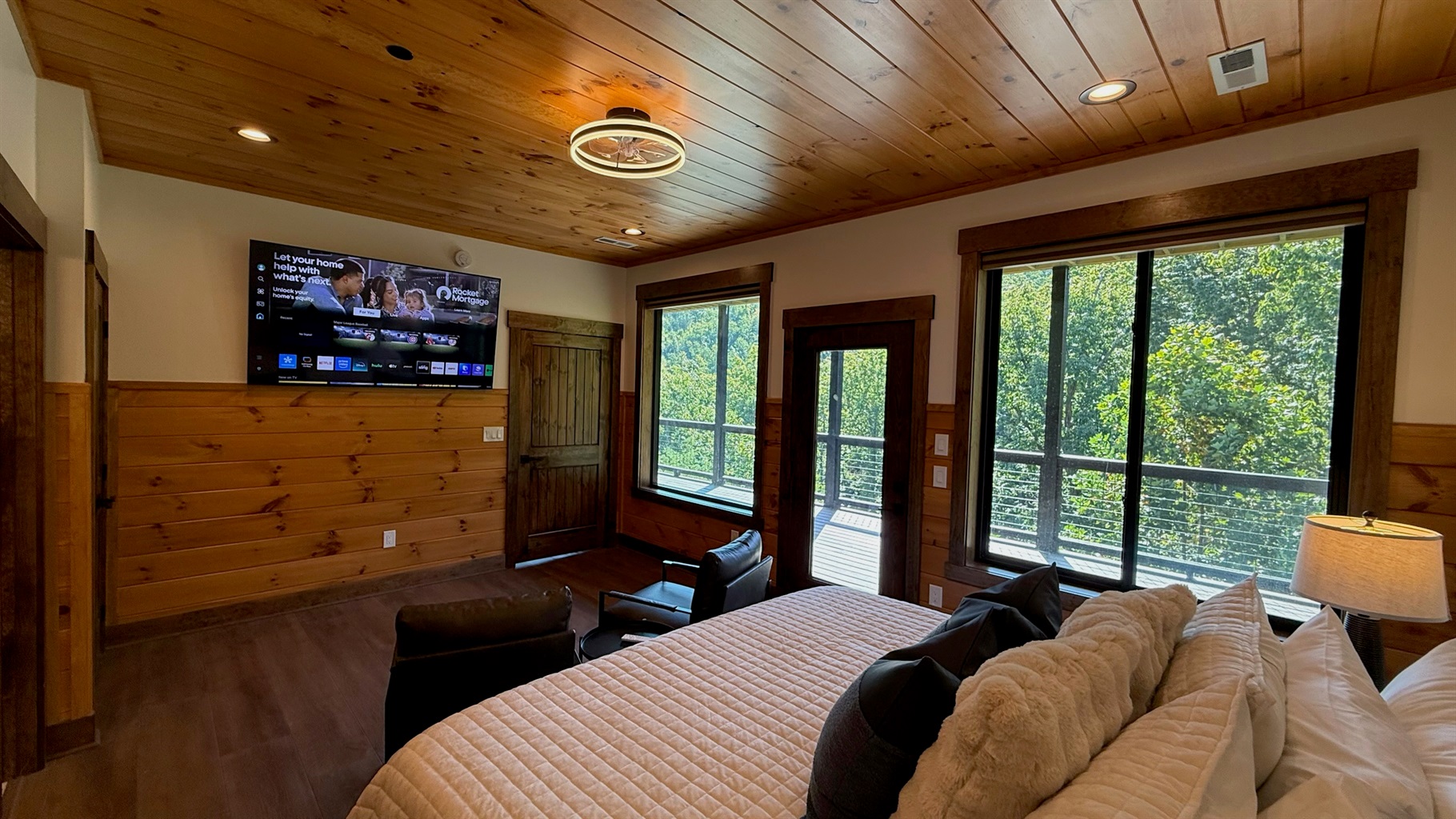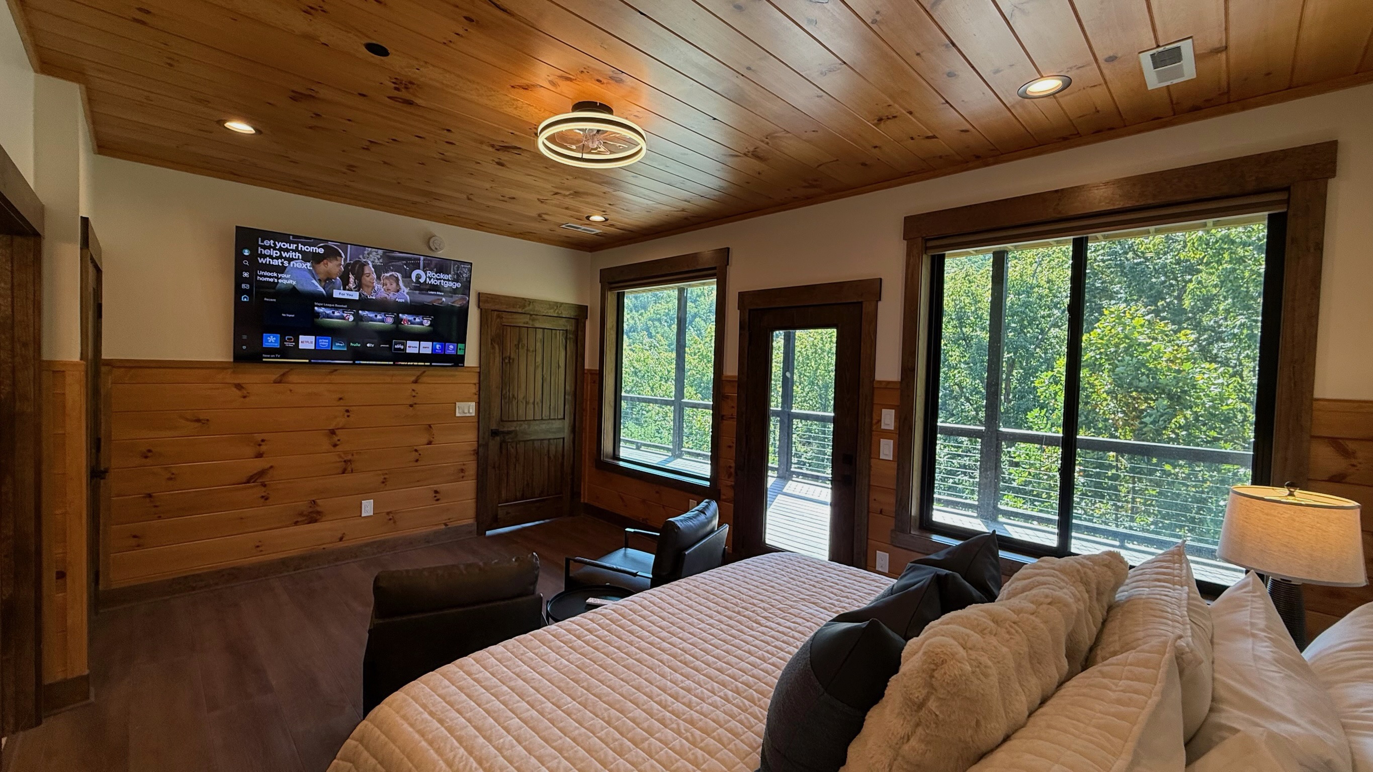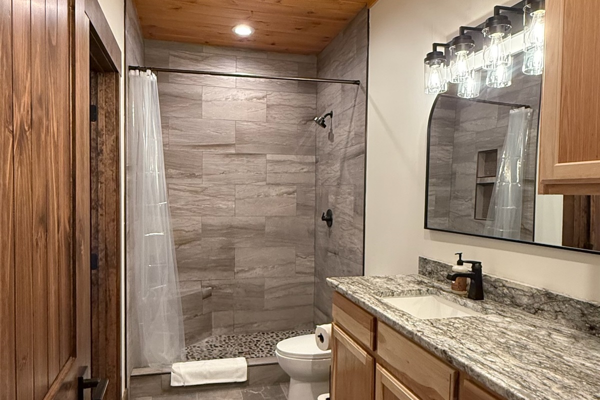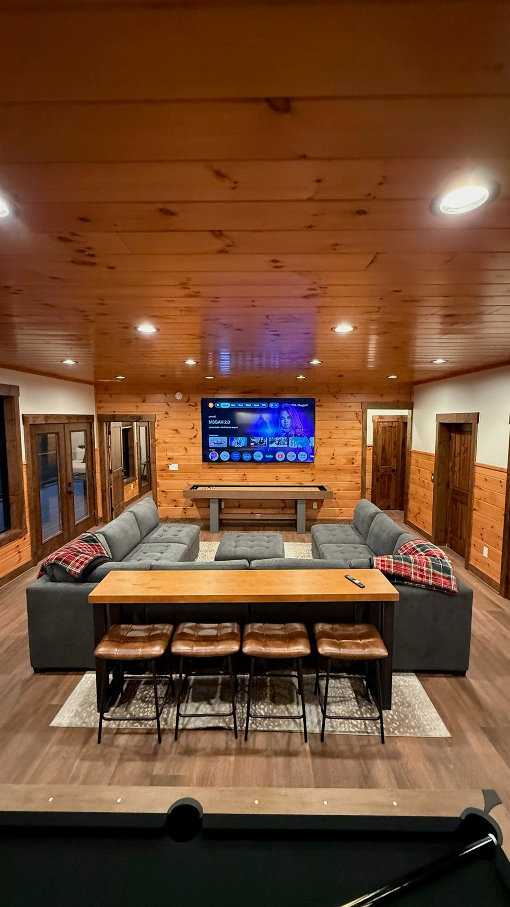 Entertainment and relaxation abound. The spacious game room features a massive 100-inch TV and a plush large sectional sofa perfect for movie nights and game days. Plus the classics all love, pool table, shuffleboard, foosball and a table to play poker or boardgames. Step just outside the gameroom onto the lower level expansive deck and play cornhole, unwind in the outdoor hot tub, or just relax in an adirondack chair soaking up the Smoky Mountain air.