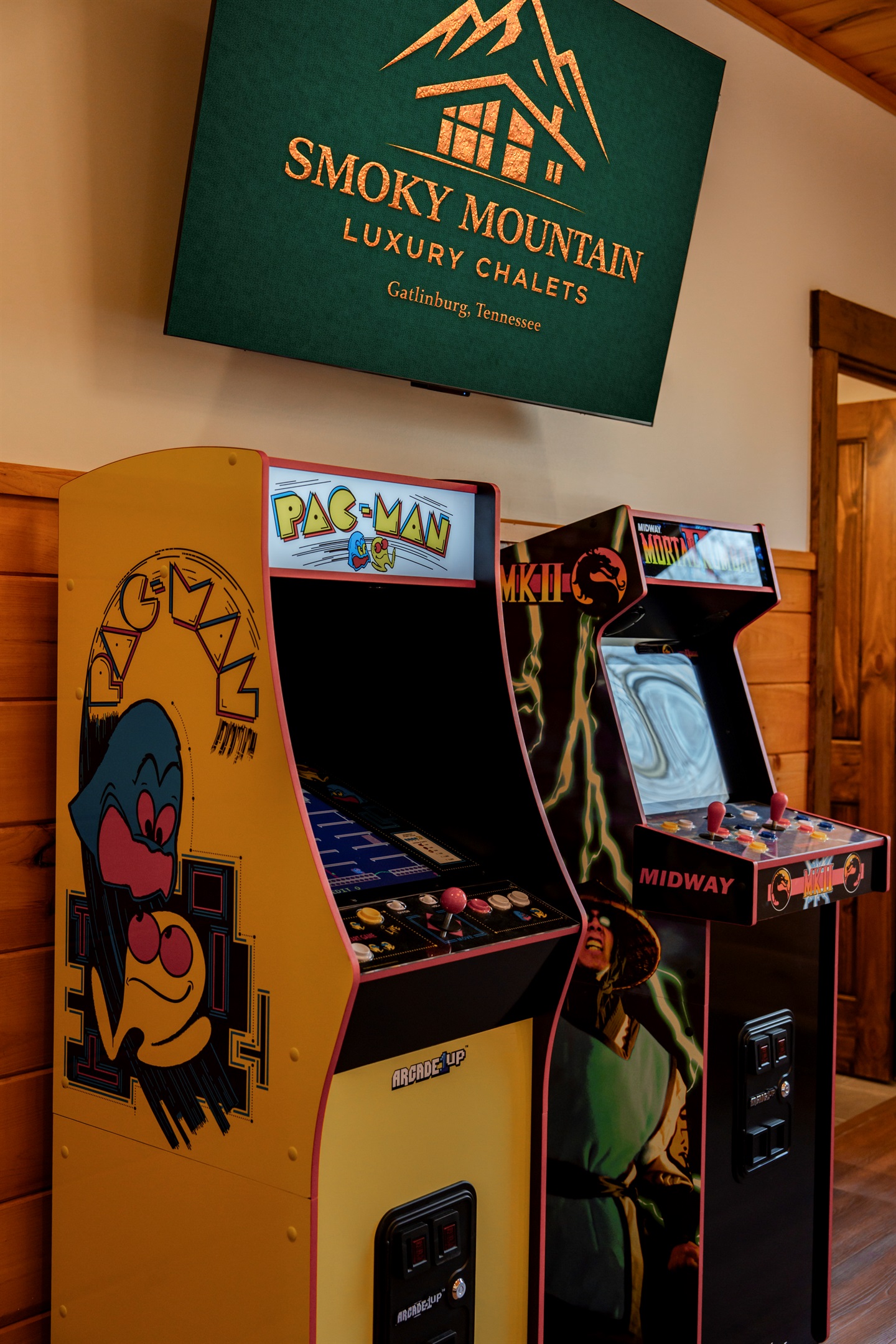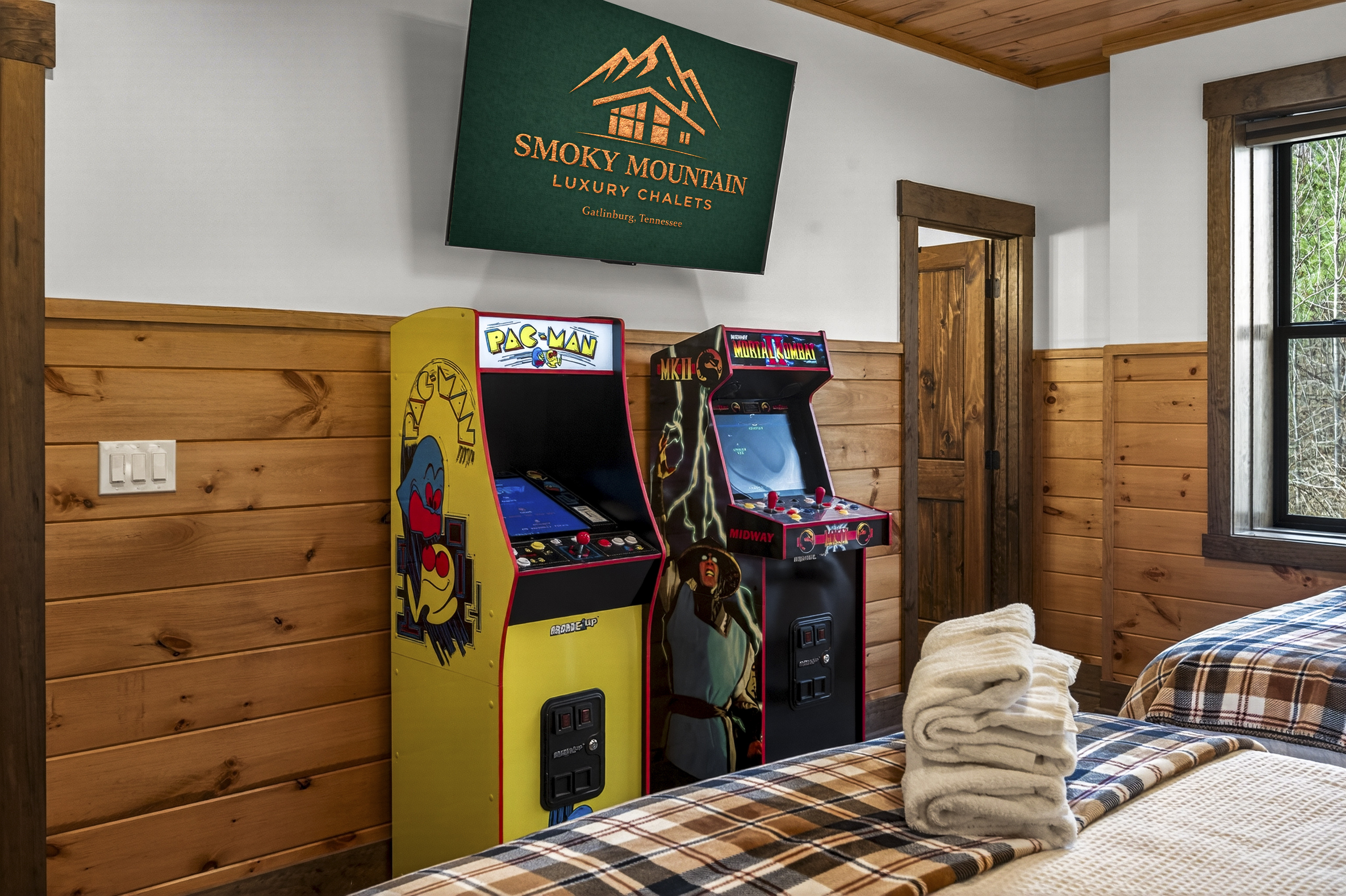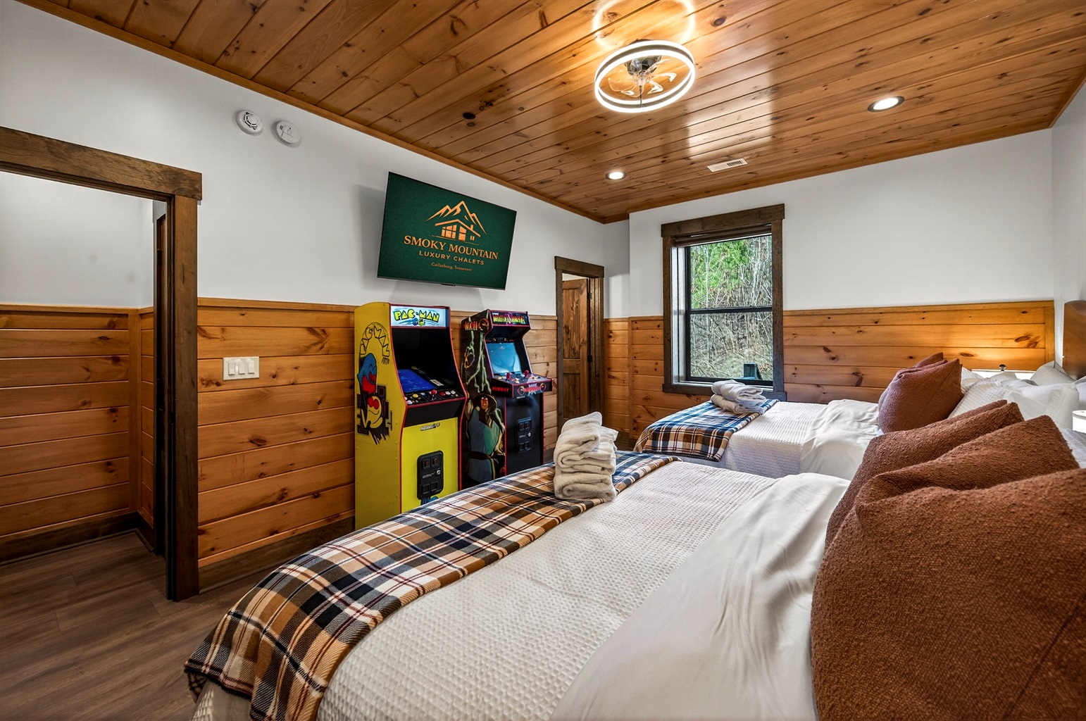 Double Queen Suite – This comfortable bedroom features two queen beds, a large TV, 2 arcades and a private en-suite bathroom with a bathtub, offering a relaxing and fun retreat after a day exploring the Smoky Mountains.