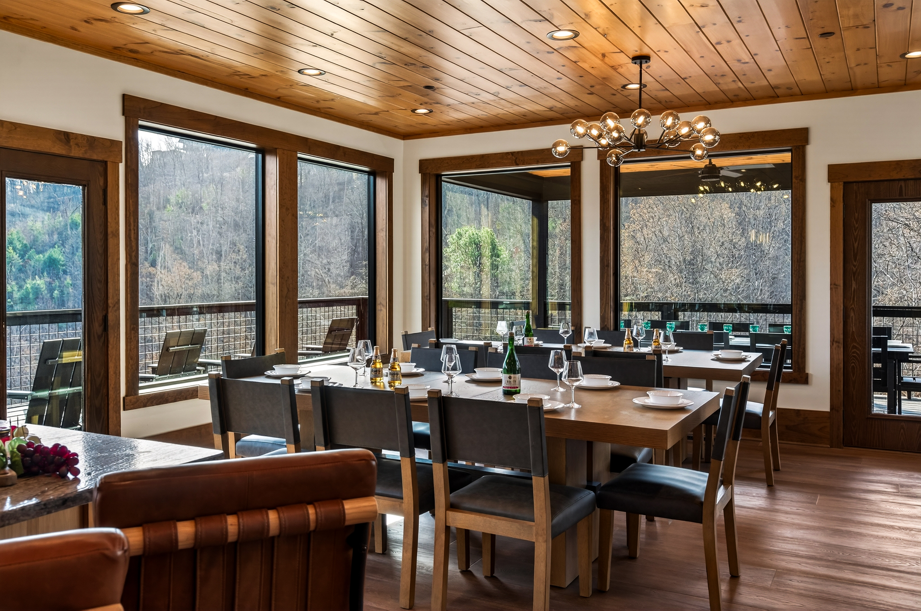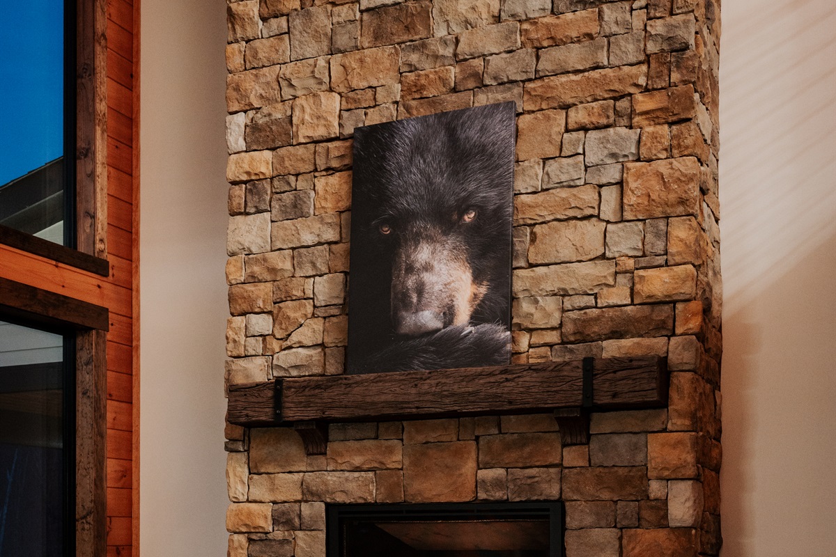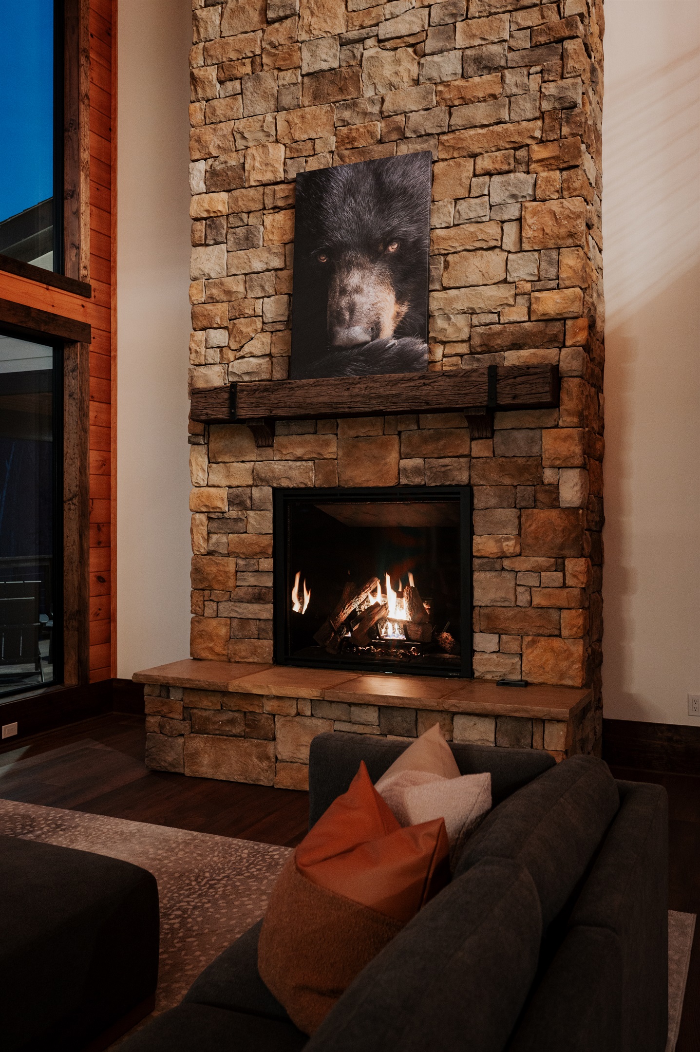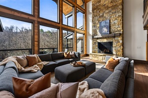 Gather beneath 30-foot vaulted ceilings surrounded by a wall of windows. Relax on the large sectional sofa beside the luxury fireplace with stunning floor-to-ceiling stone, creating a warm and unforgettable mountain lodge atmosphere.