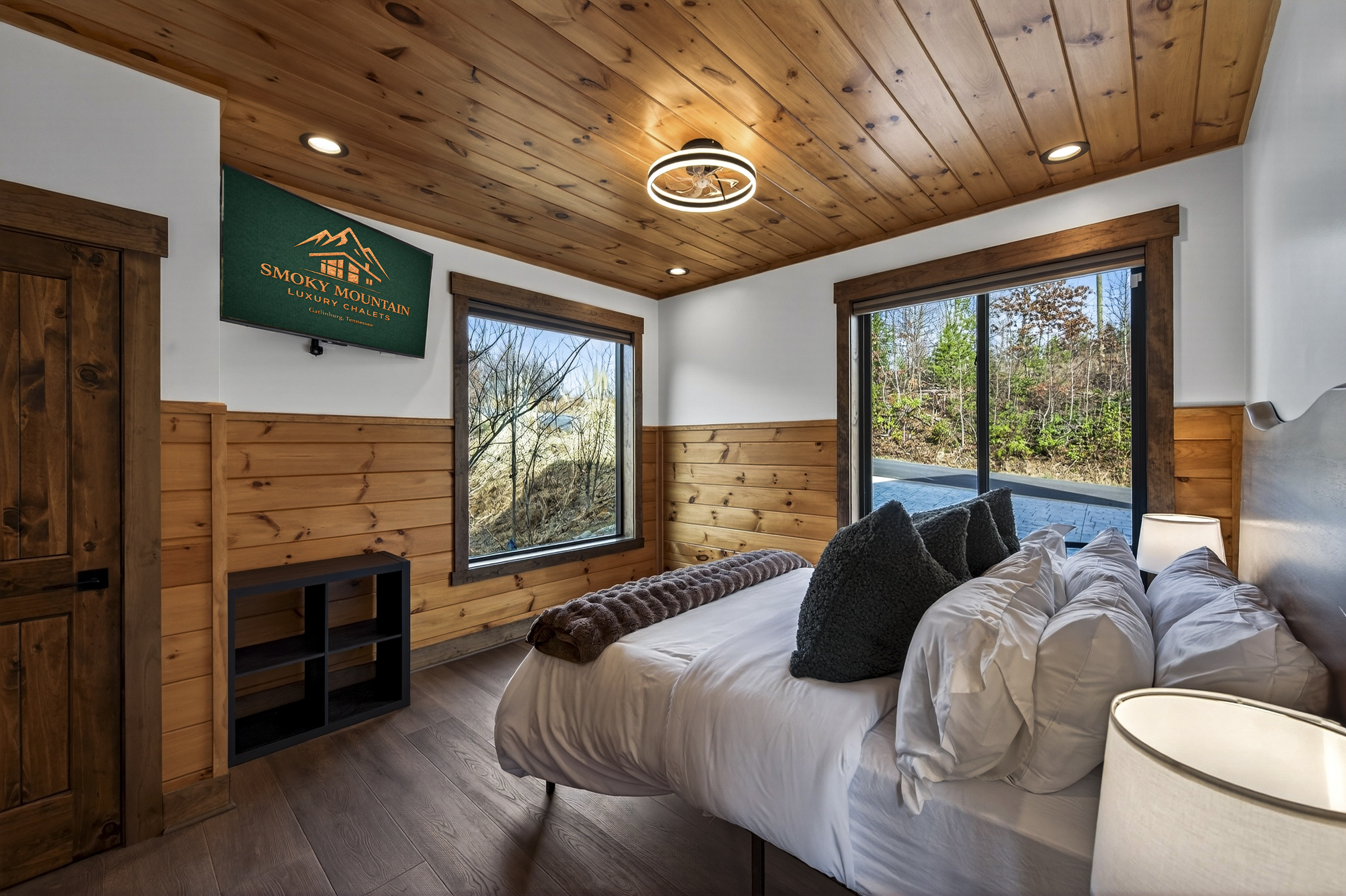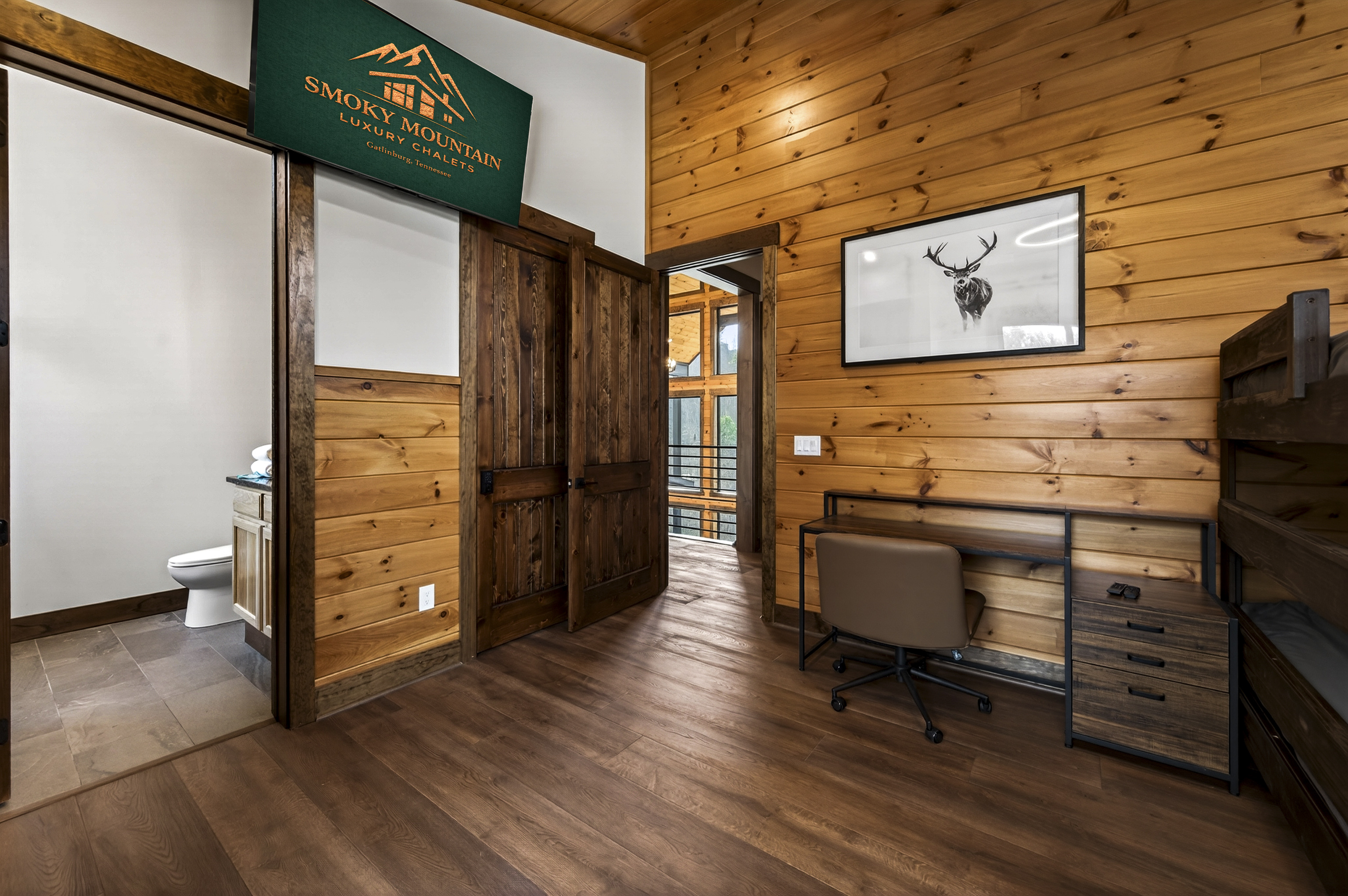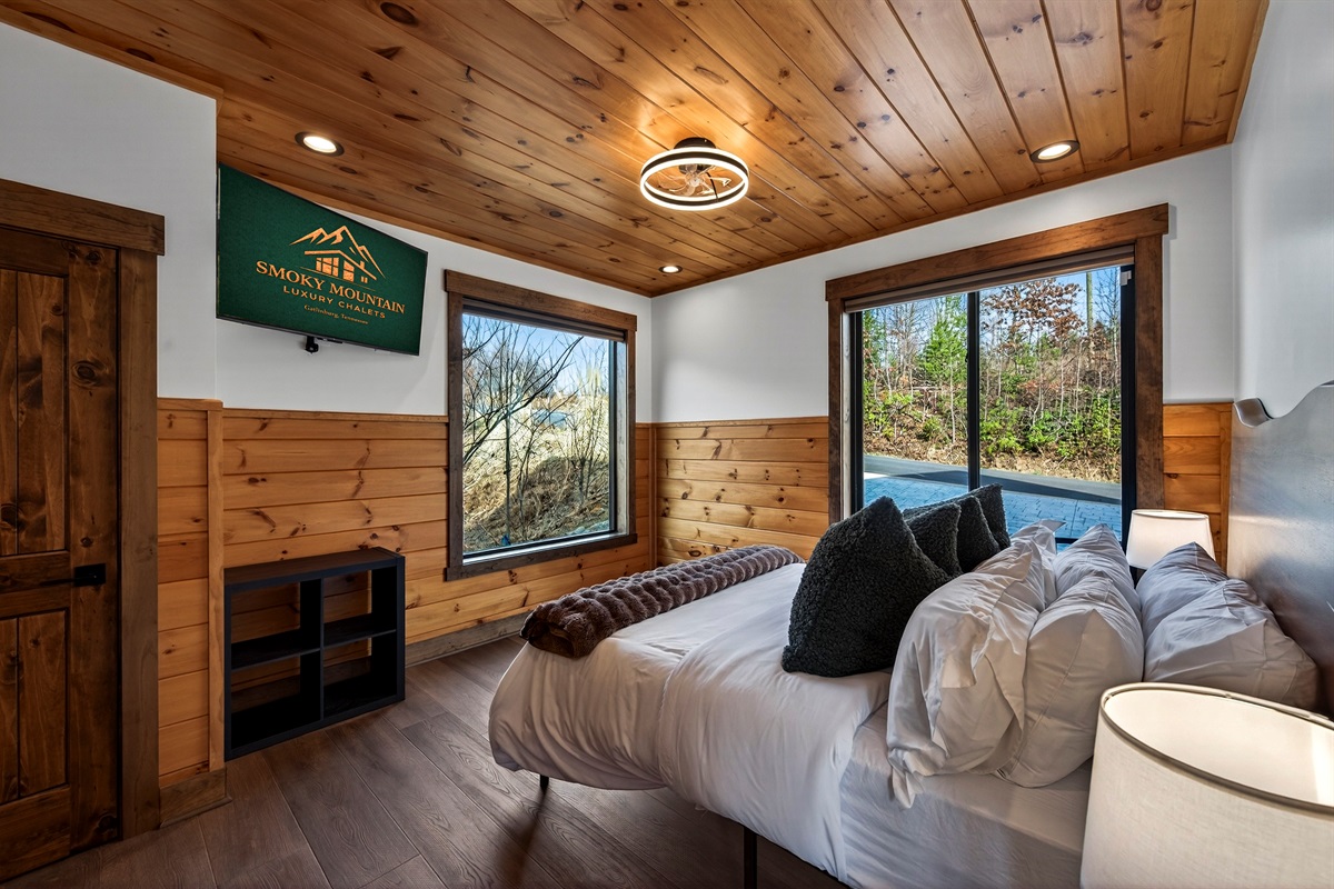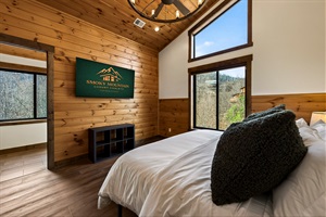 Relax in the spacious king bedroom with a large TV, dedicated desk workspace & direct deck access. Unwind in the en-suite bathroom featuring a walk-in shower with a natural river rock floor, bringing the Smoky Mountains indoors for a spa retreat.