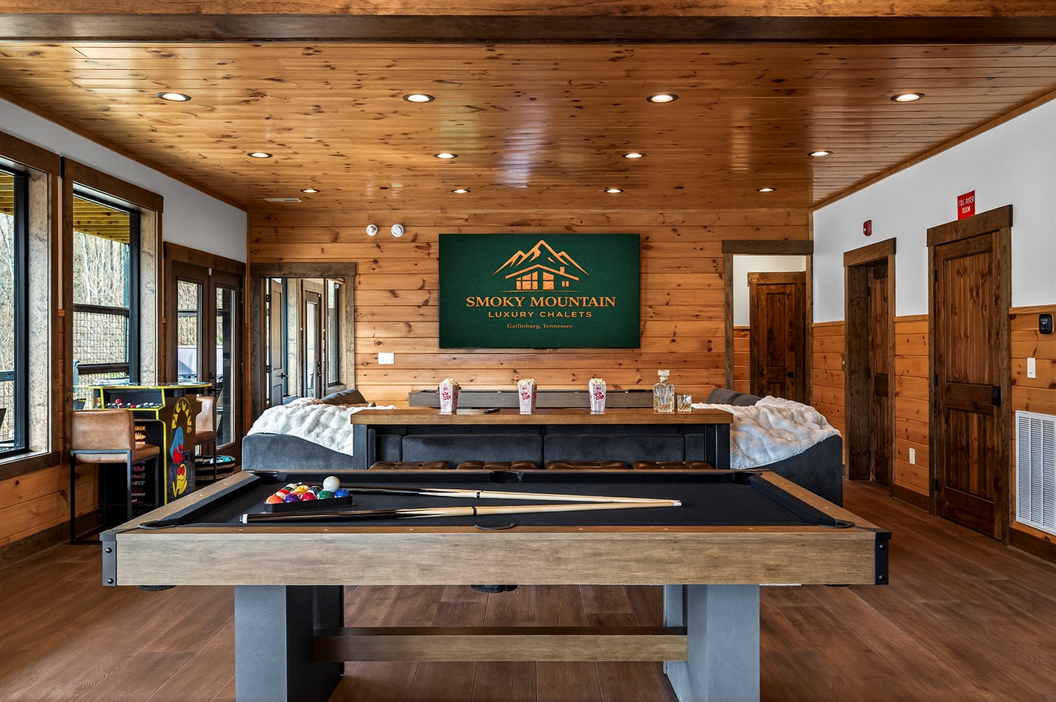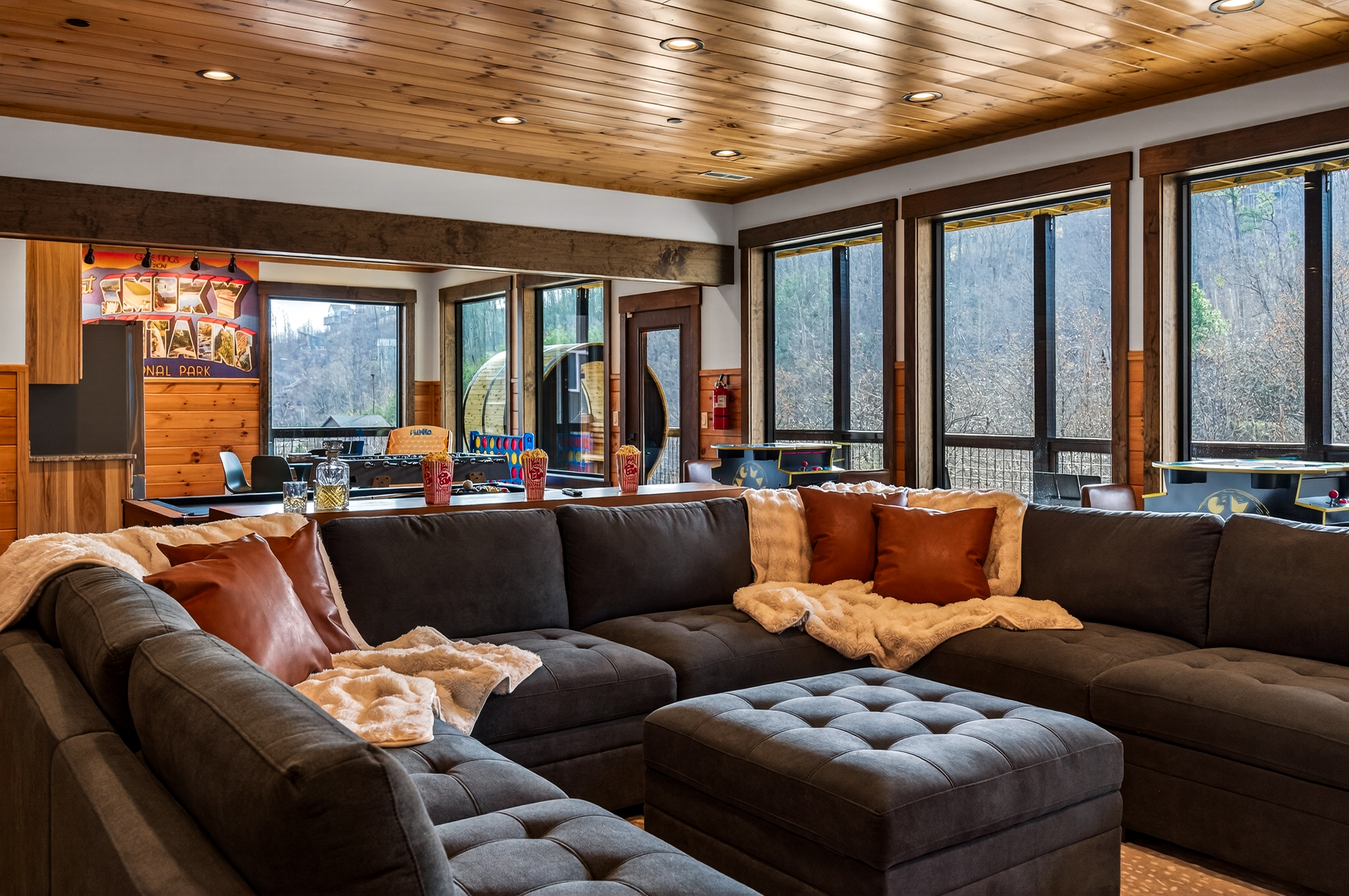 The perfect hangout after a day exploring the Smokies. Watch movies or the big game on the massive 100-inch TV, relax on the plush sectional, or grab a drink at the bar-top seating. Enjoy hours of fun with pool, shuffleboard, foosball, and classic arcade t