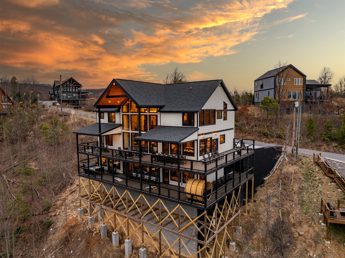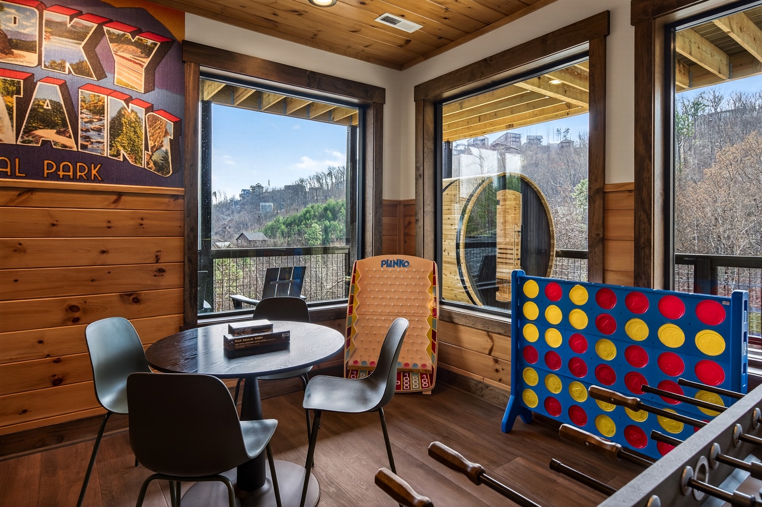 🌅 Sunset Sauna in the Smokies – Unwind in the outdoor sauna as the Smoky Mountains glow at dusk. The large picture window lets you relax, detox, and take in the peaceful mountain views as the sun sets.