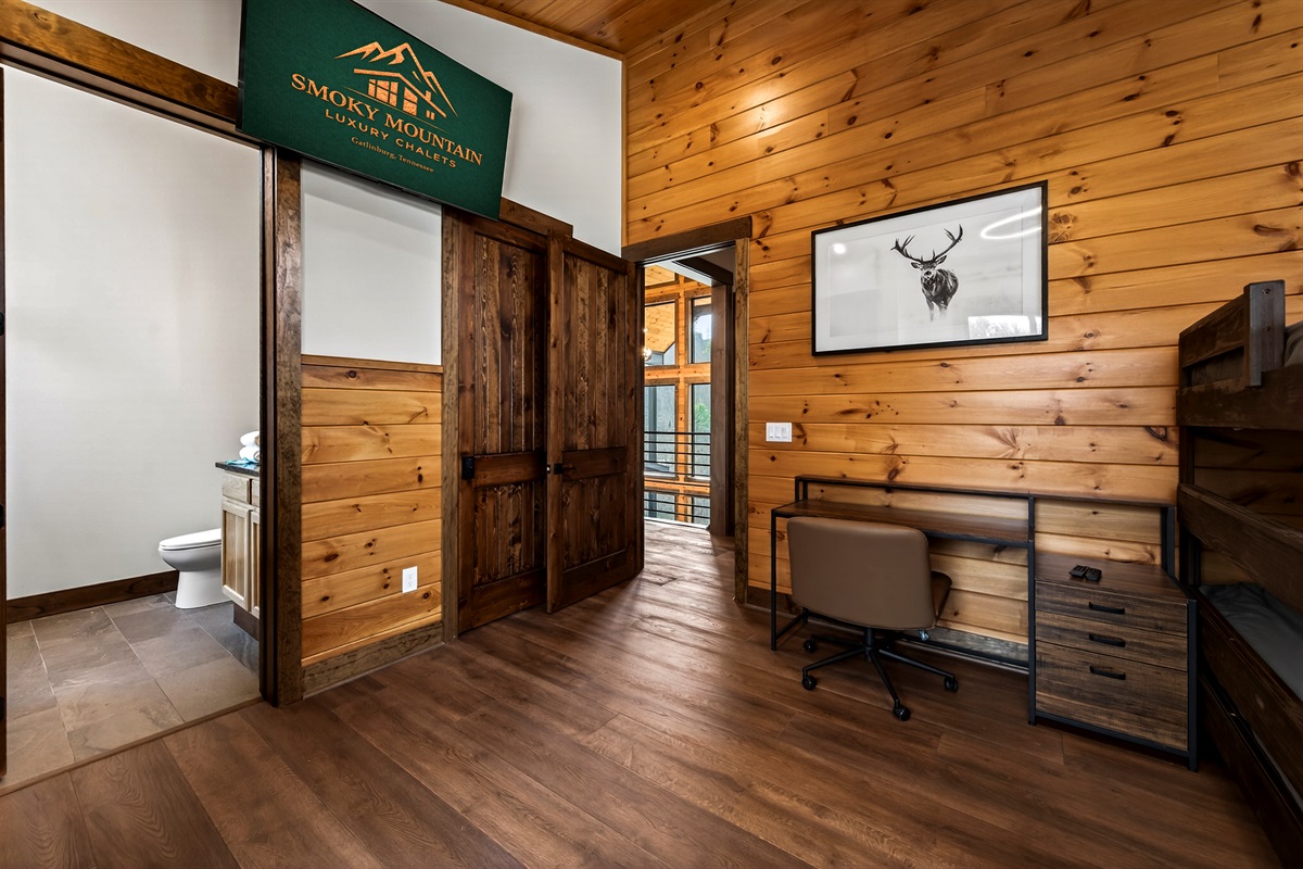 🛏️ Spacious Bunk Suite – Perfect for groups or families, this room features two queen-over-queen bunk beds, vaulted ceilings, a desk workspace, and a private en-suite bathroom for comfort and convenience. Bedrooms sleeps 8 guests comfortably.