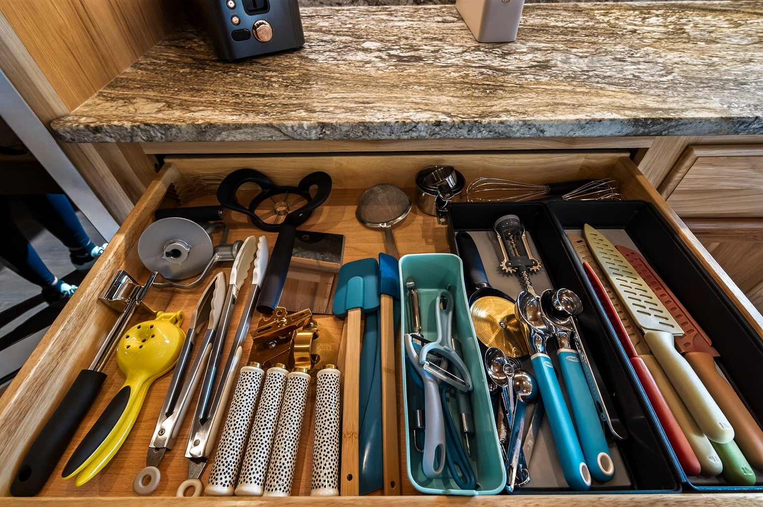 Fully Stocked Kitchen - Cooking knives, peelers, garlic press, citrus squeezer, meat tenderizer, pizza cutter, ice cream scoop, apple slicer and more!
