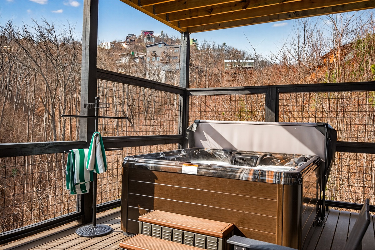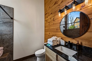 Relax in the spacious king bedroom on the game room level with a big TV, desk & direct deck hot tub access. Unwind in the en-suite bathroom featuring a walk-in shower with a natural river rock floor, bringing the Smoky Mountains indoors for a spa retreat.