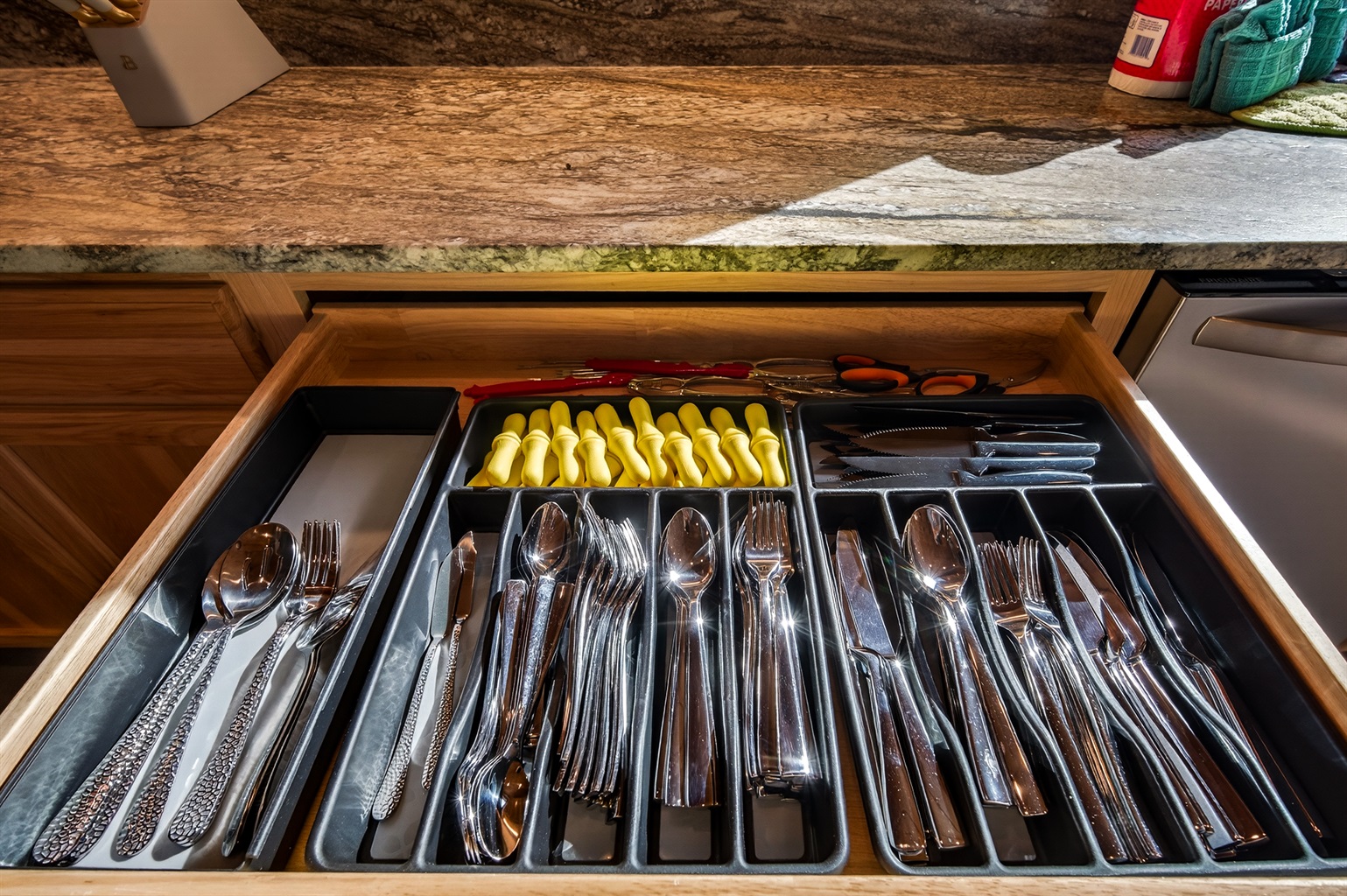 Silverware so that everyone in the group can eat at the same time and a load in the dishwasher! Corn on the cob holders, seafood utensils - shell cracker, shellers, crab forks, scissors and of course steak knives!