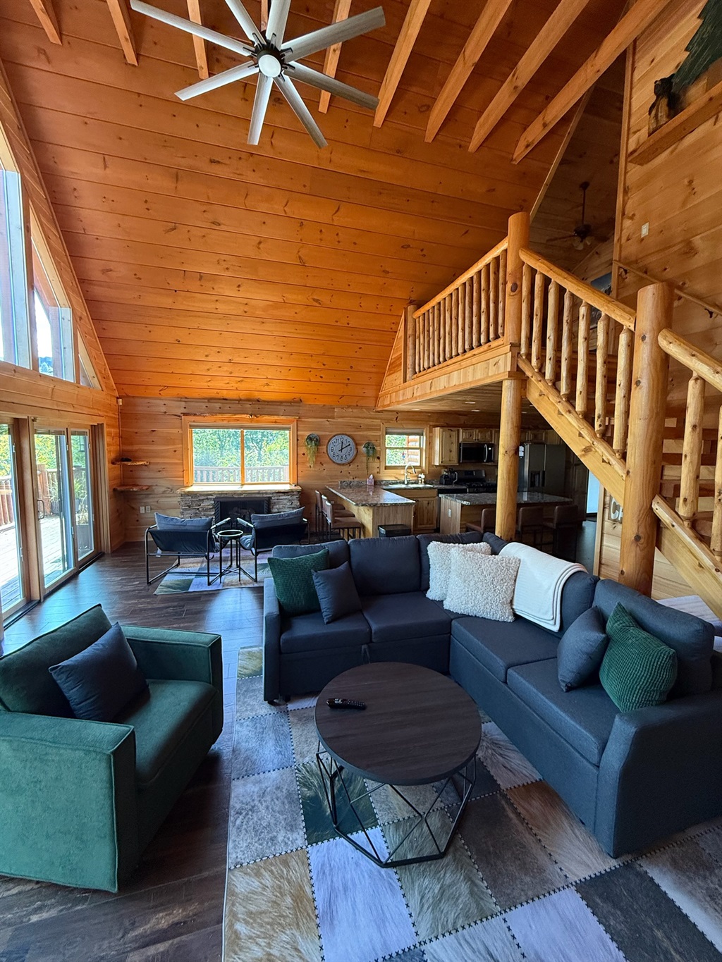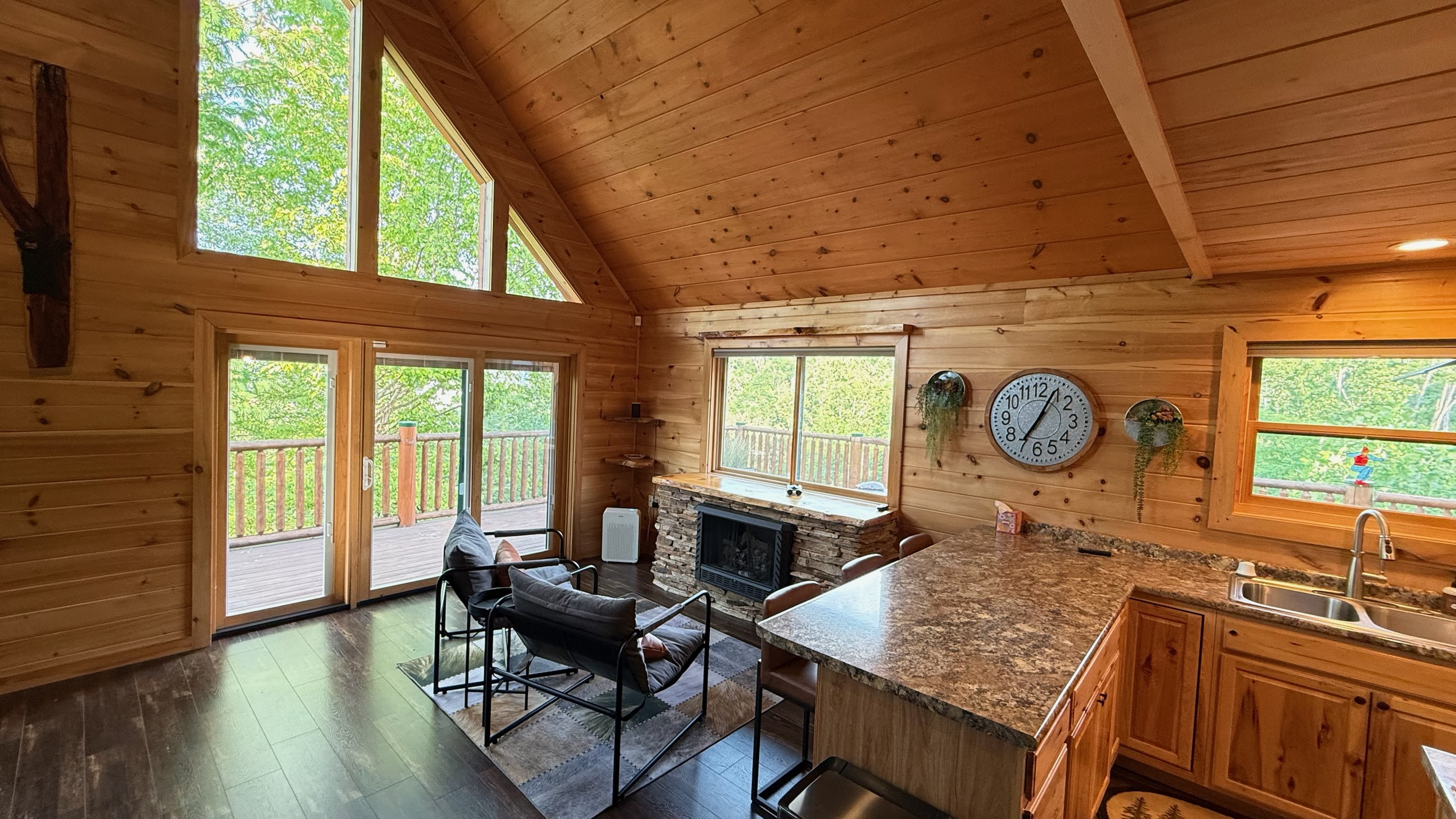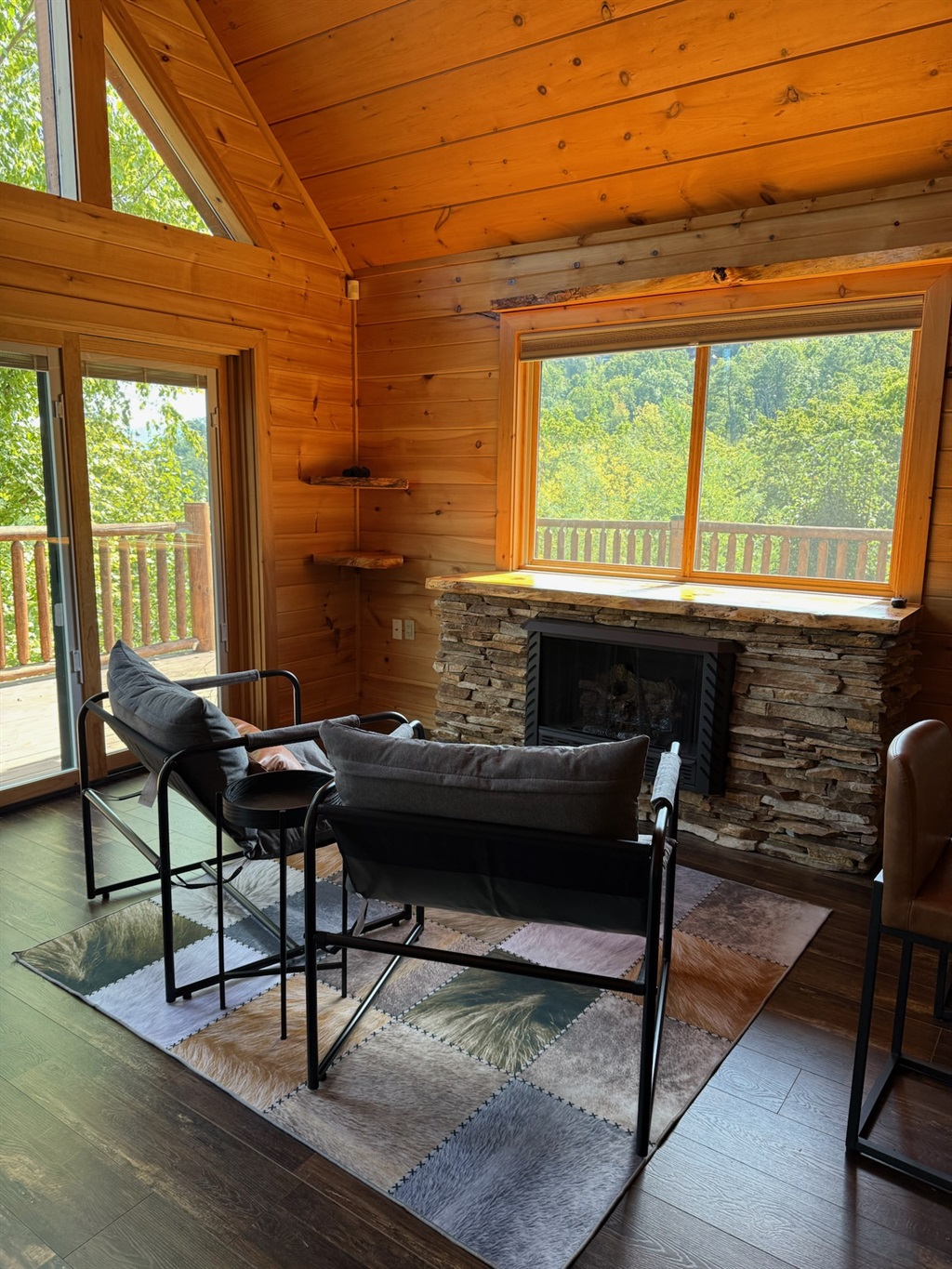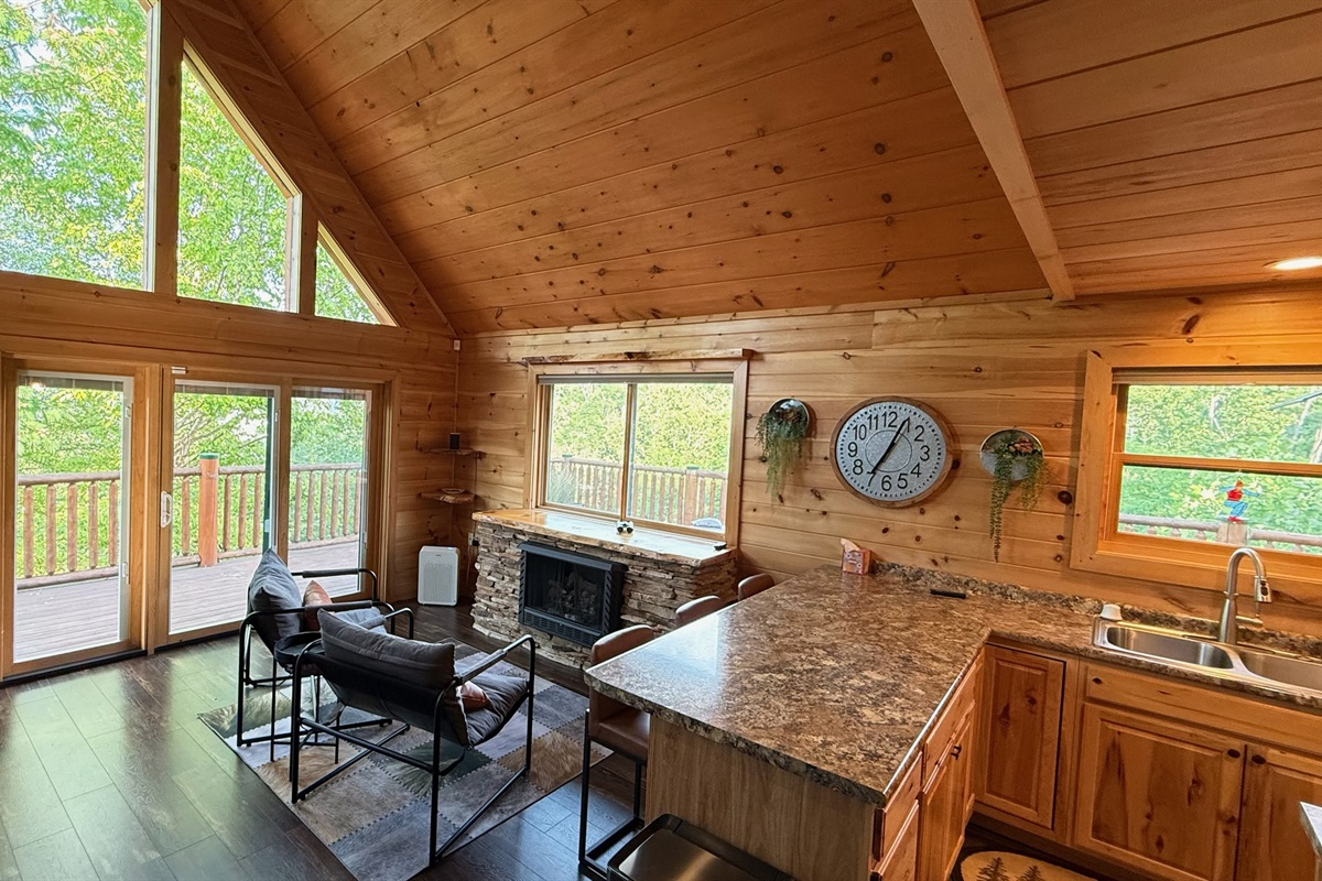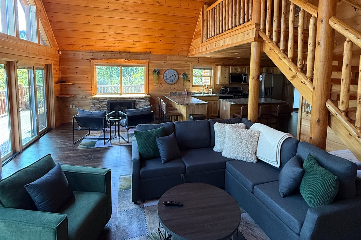 Step inside and be welcomed by soaring vaulted ceilings and a wall of large windows that fill the chalet with natural light and frame breathtaking mountain and forest views. Cozy up by the stone fireplace, gather with friends and family, and enjoy the peaceful mountain atmosphere.